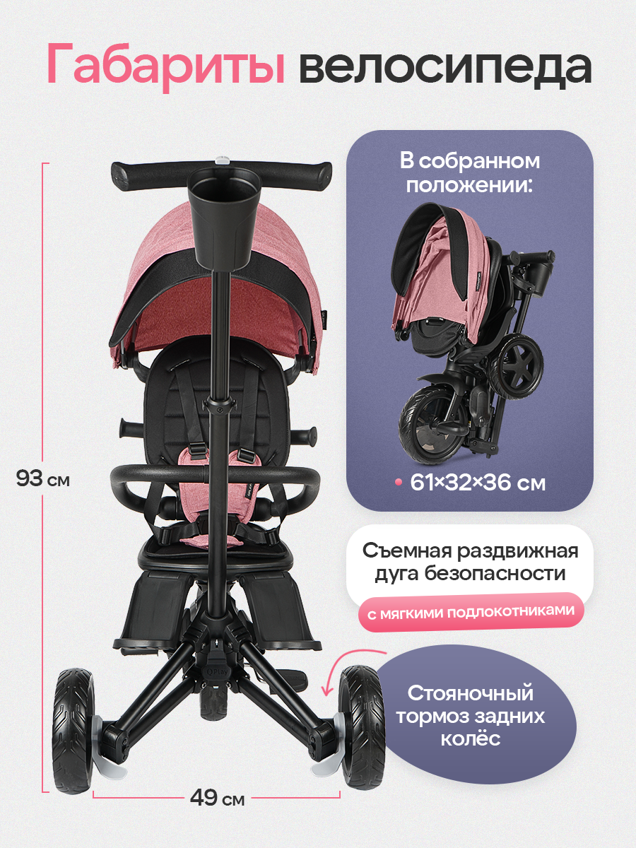 Велосипед трёхколёсный с ручкой NOVA (колёса 8.5"/7.5", складной), розовый информация: