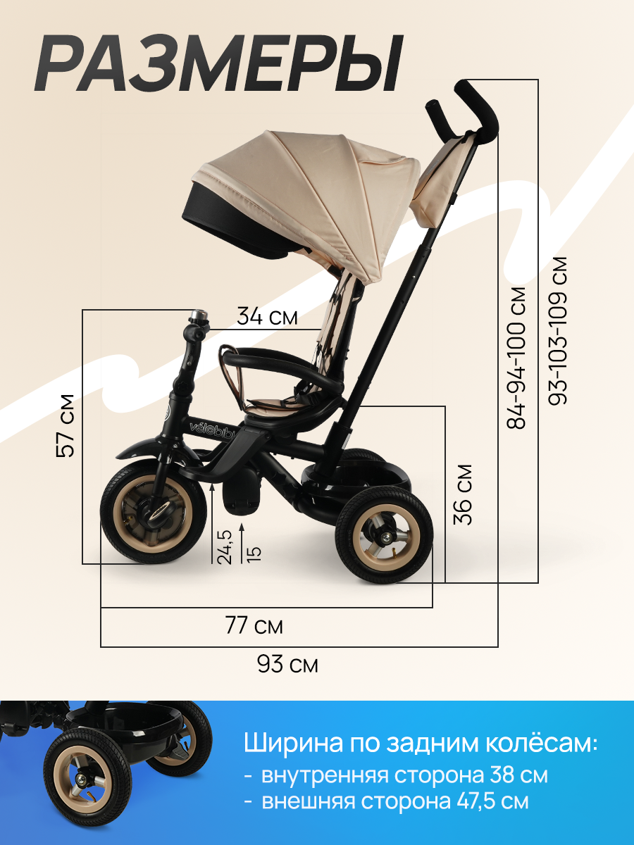Велосипед трехколесный с ручкой ПРАЙМ PLUS, резиновые колеса, звонок, бежевый информация: