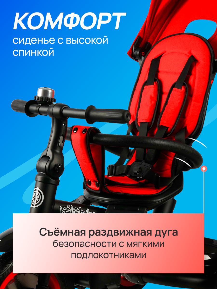 Велосипед трехколесный детский, с родительской ручкой и козырьком, 658, красный
