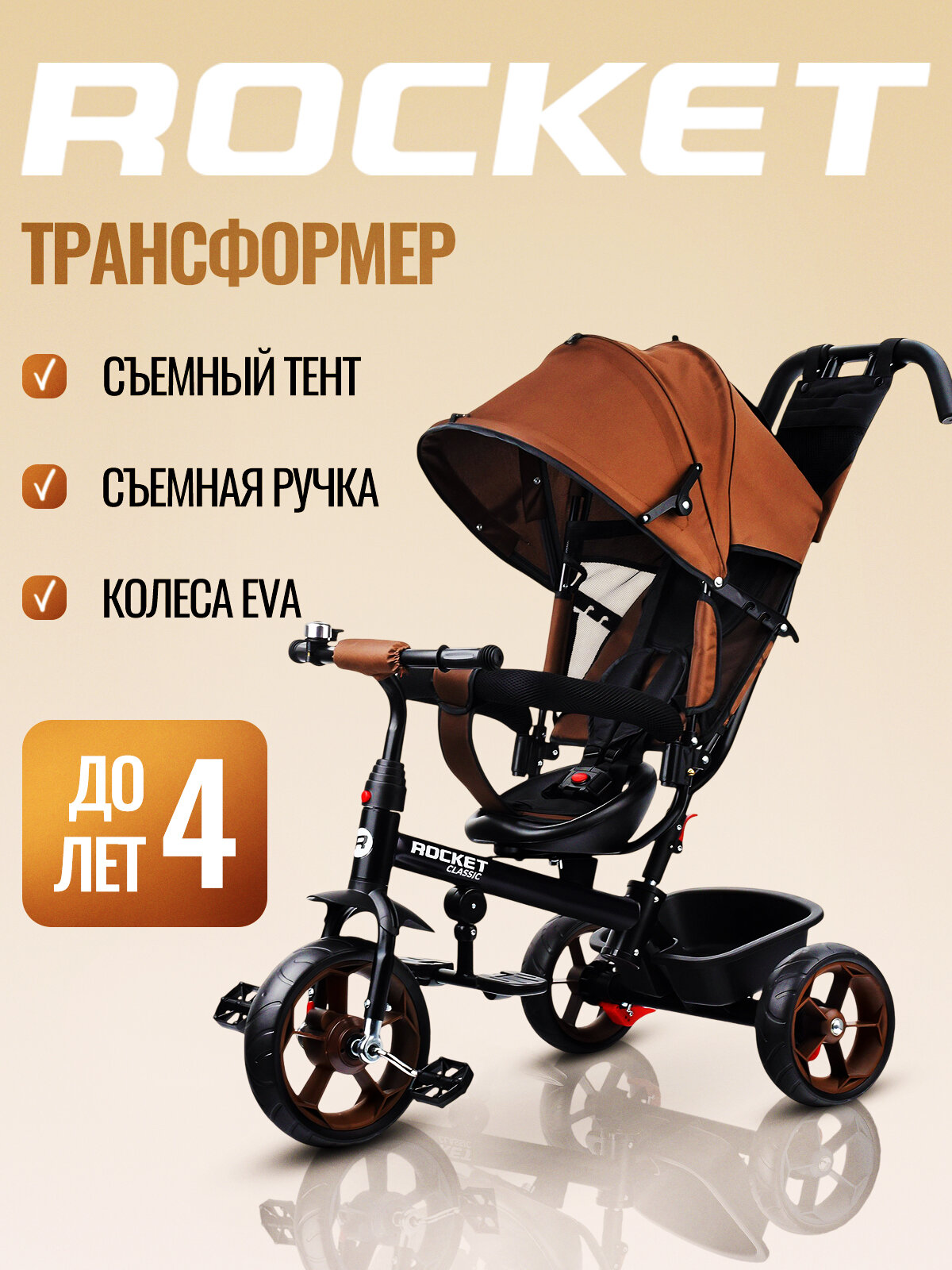Велосипед Rocket 136 трехколесный с родительской ручкой и козырьком, колеса EVA 10"/8", цвет коричневый информация: