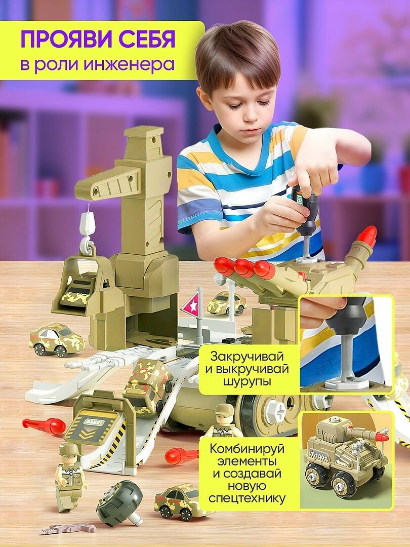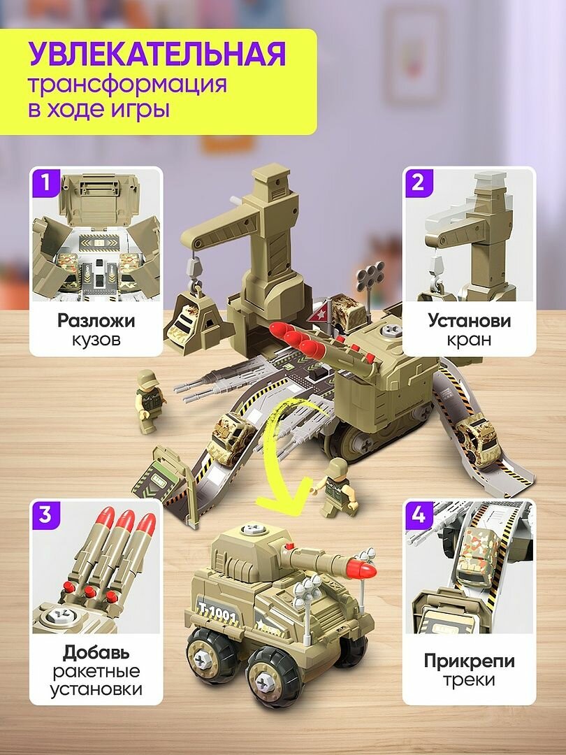 Отзывы на Конструктор для мальчика Play Okay военный танк, с машинками и ракетами, катапульта, с кейсом для хранения
