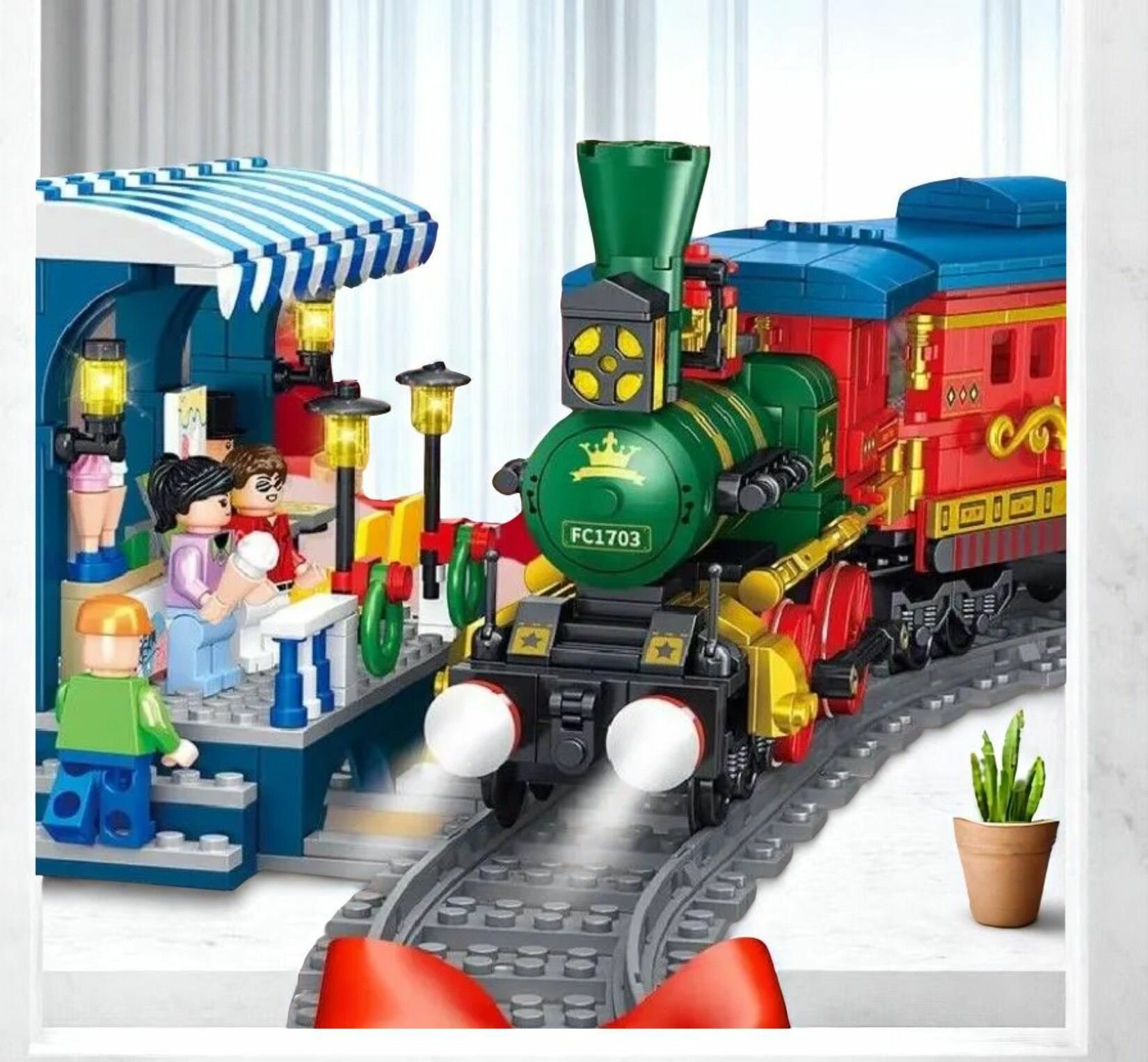 Новогодний конструктор железная дорога с поездом и вагонами, сопоставим с лего 717 деталей информация:
