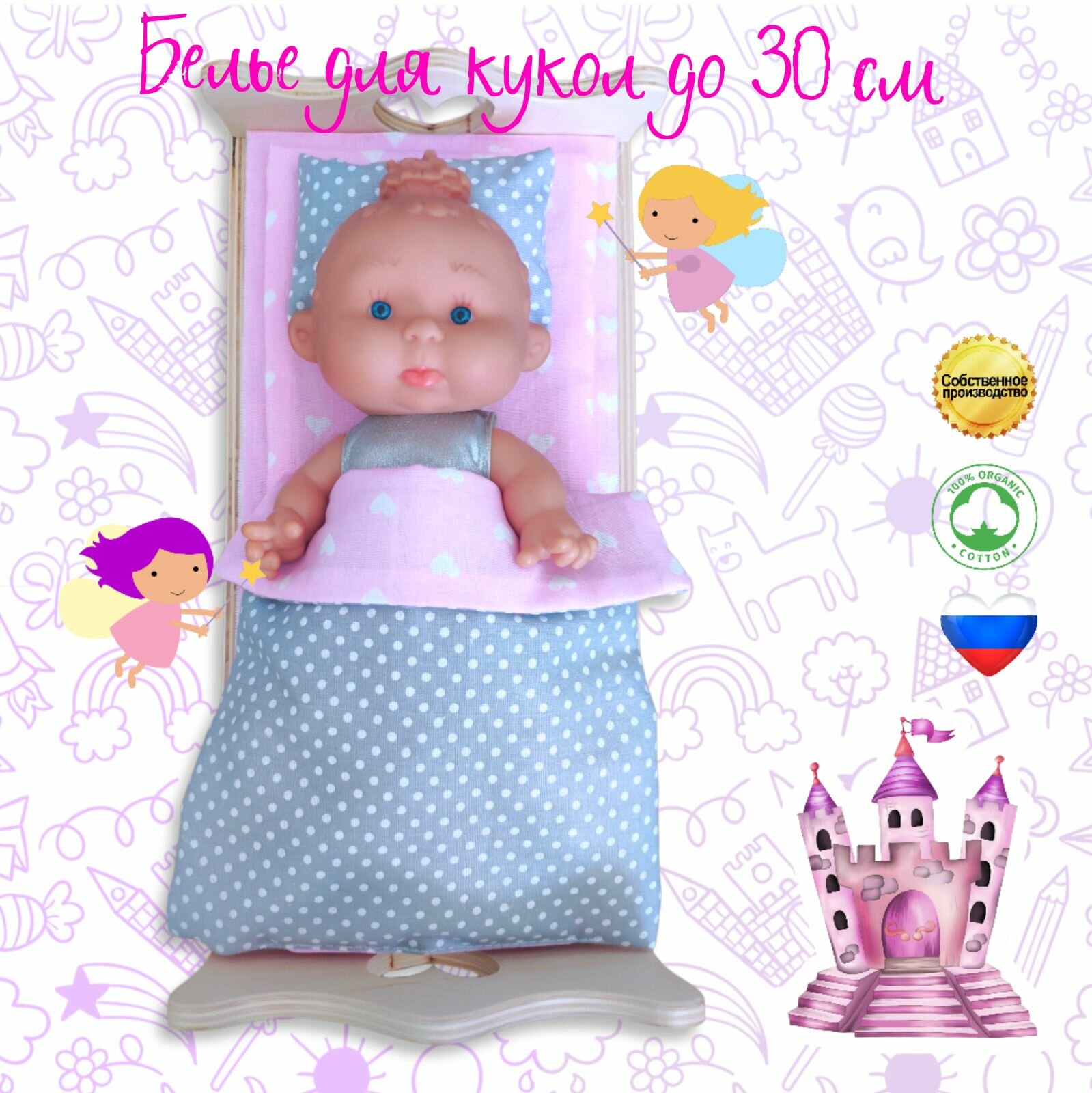 Комплект белья для куклы до 30 см, Сердечки и горошки информация: