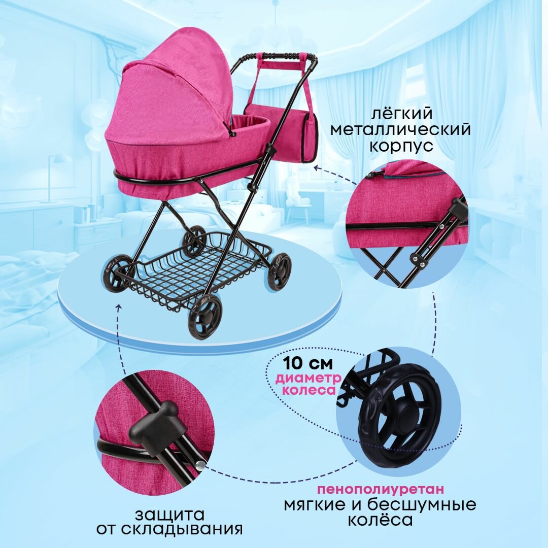 Коляска детская для кукол до 45 см с люлькой и сумкой, металлическая, размеры 63х35х71см. Подарок для девочек 3+ Артикул 9325-F информация: