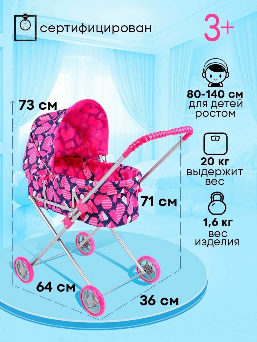 Коляска складывающаяся для кукол с люлькой до 45 см. Размеры 63,5х36х73см. Артикул 9308-D. информация: