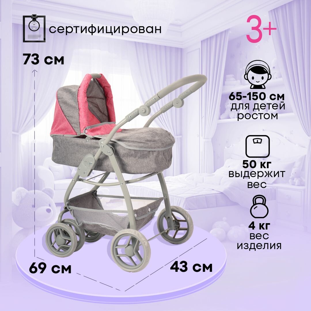 Коляска для кукол до 50 см с люлькой 3в1 размеры 77х44х83см. Подарок для девочек 3+ Артикул 9333-B