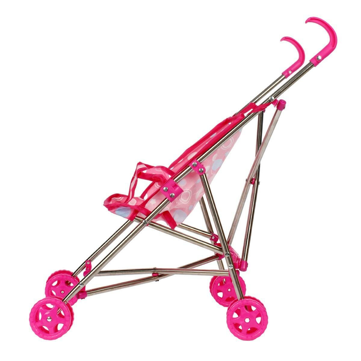 Дополнительная информация | коляска-трость для кукол, ярко-розовый цвет, складная конструкция, 4 колеса, ремень безопасности, легкий и компактный дизайн |