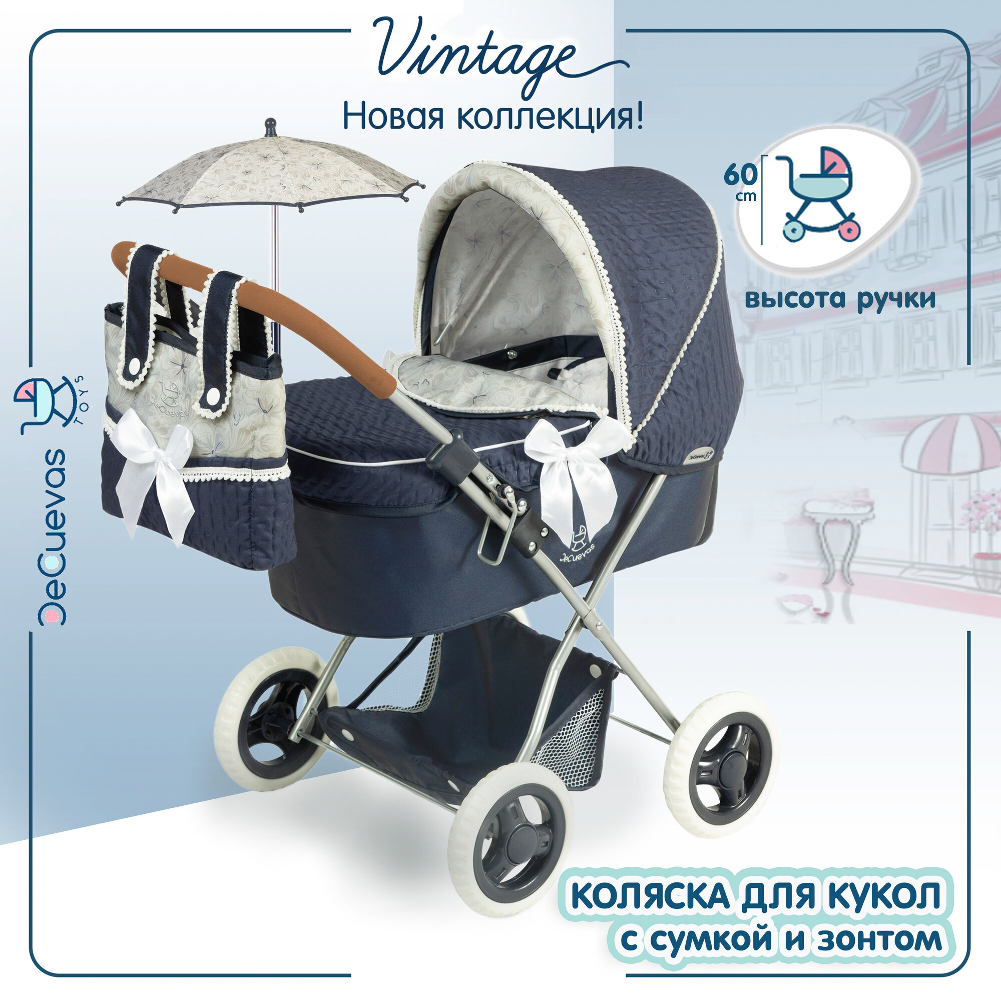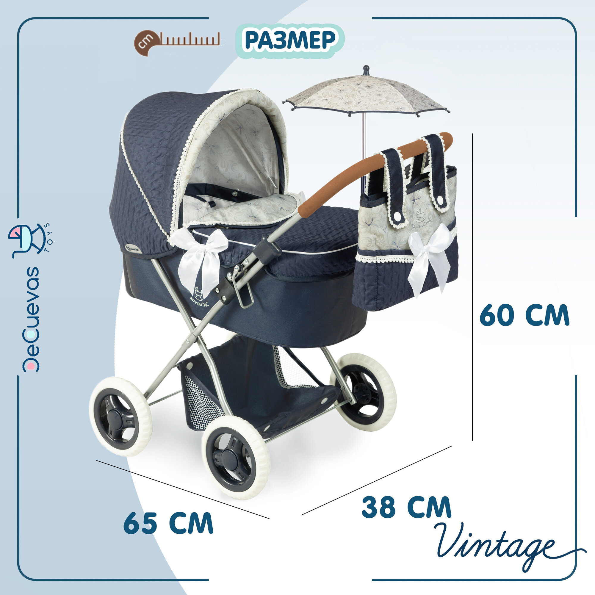 Коляска для кукол люлька с сумкой и зонтом DeCuevas Toys 85044, высота ручки 60 см, серия "Винтаж" информация: