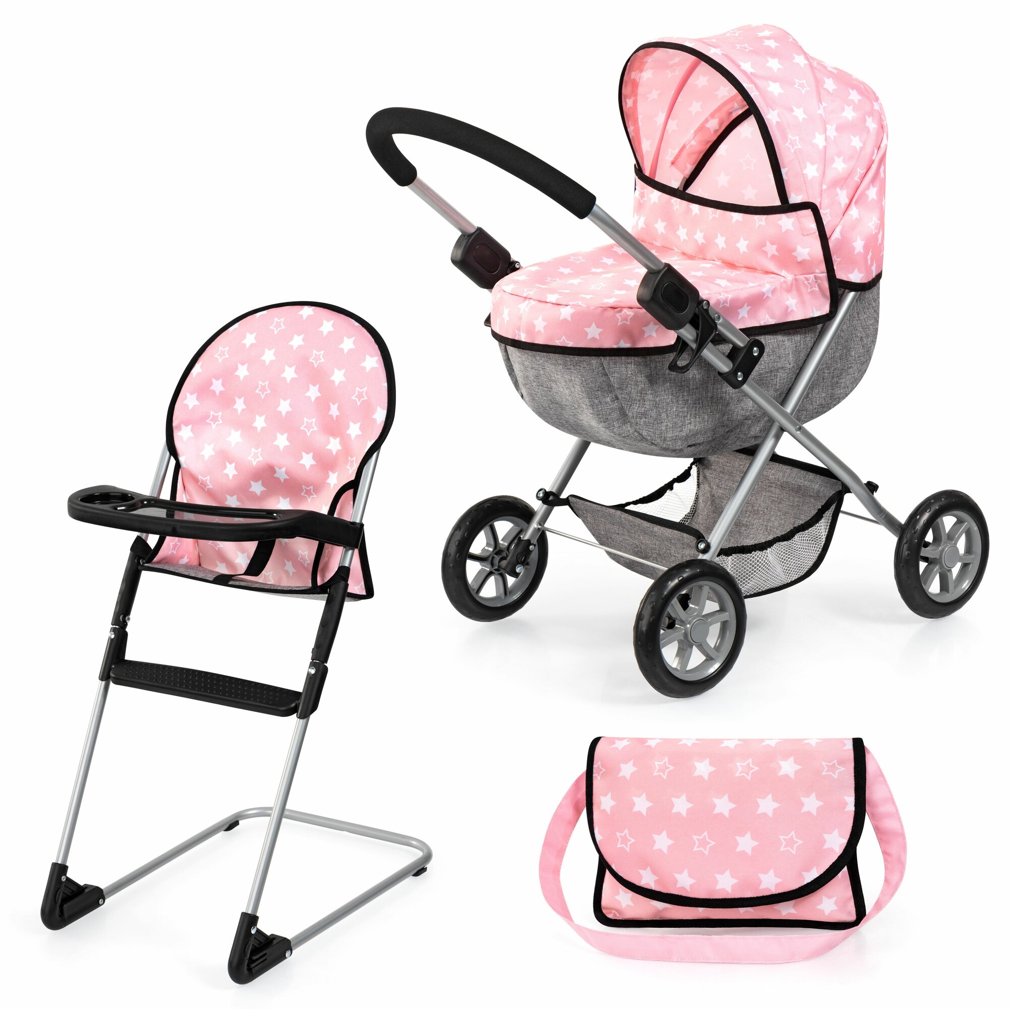 10 цен на Набор для кукол с коляской и стульчиком для кормления розово-серый