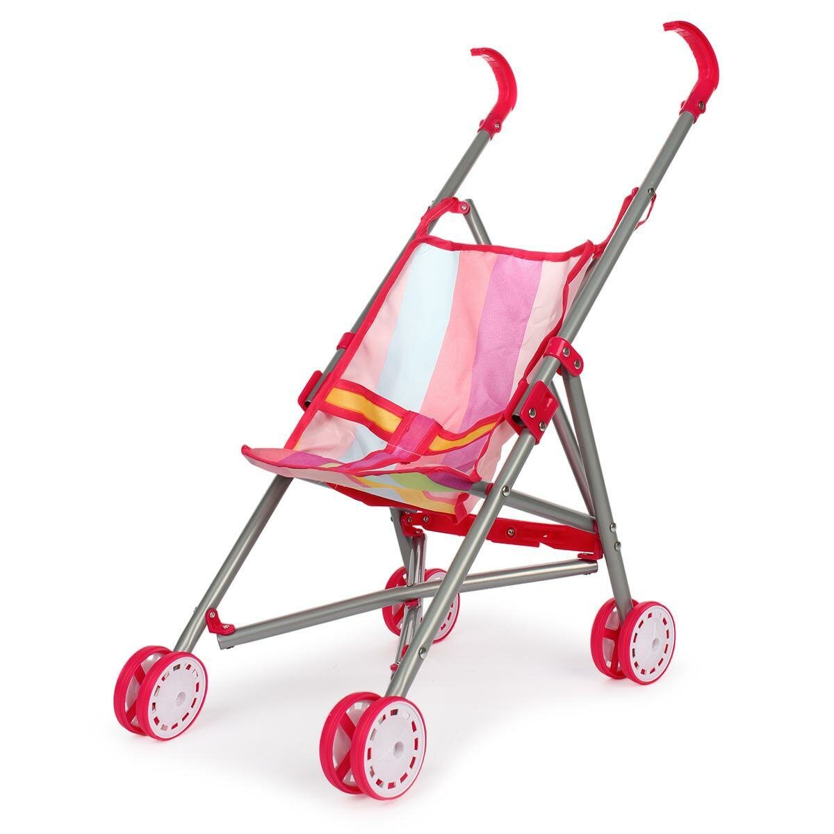 | Дополнительная информация | коляска-трость для кукол, каркас из облегченного металла, складная конструкция, высота ручки 52 см, рекомендуемый размер куклы 30 см, колеса диаметром 11 см, текстильное покрытие с полосатым дизайном, легко собирается и не занимает много места |