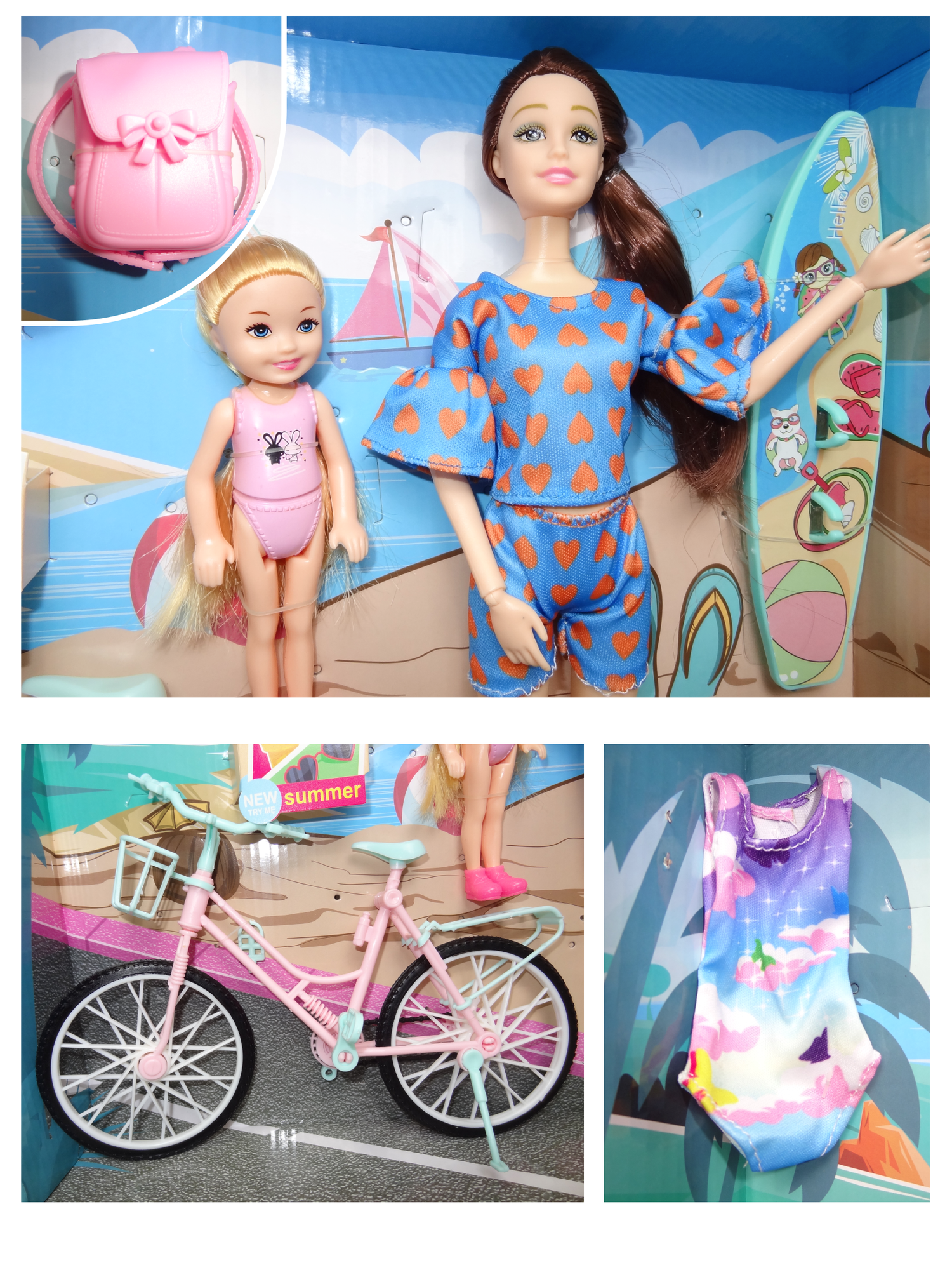 Отзывы на Кукла для девочек шарнирная 29 см на велосипеде с ребенком 14 см, питомцем и аксессуарами для пляжа