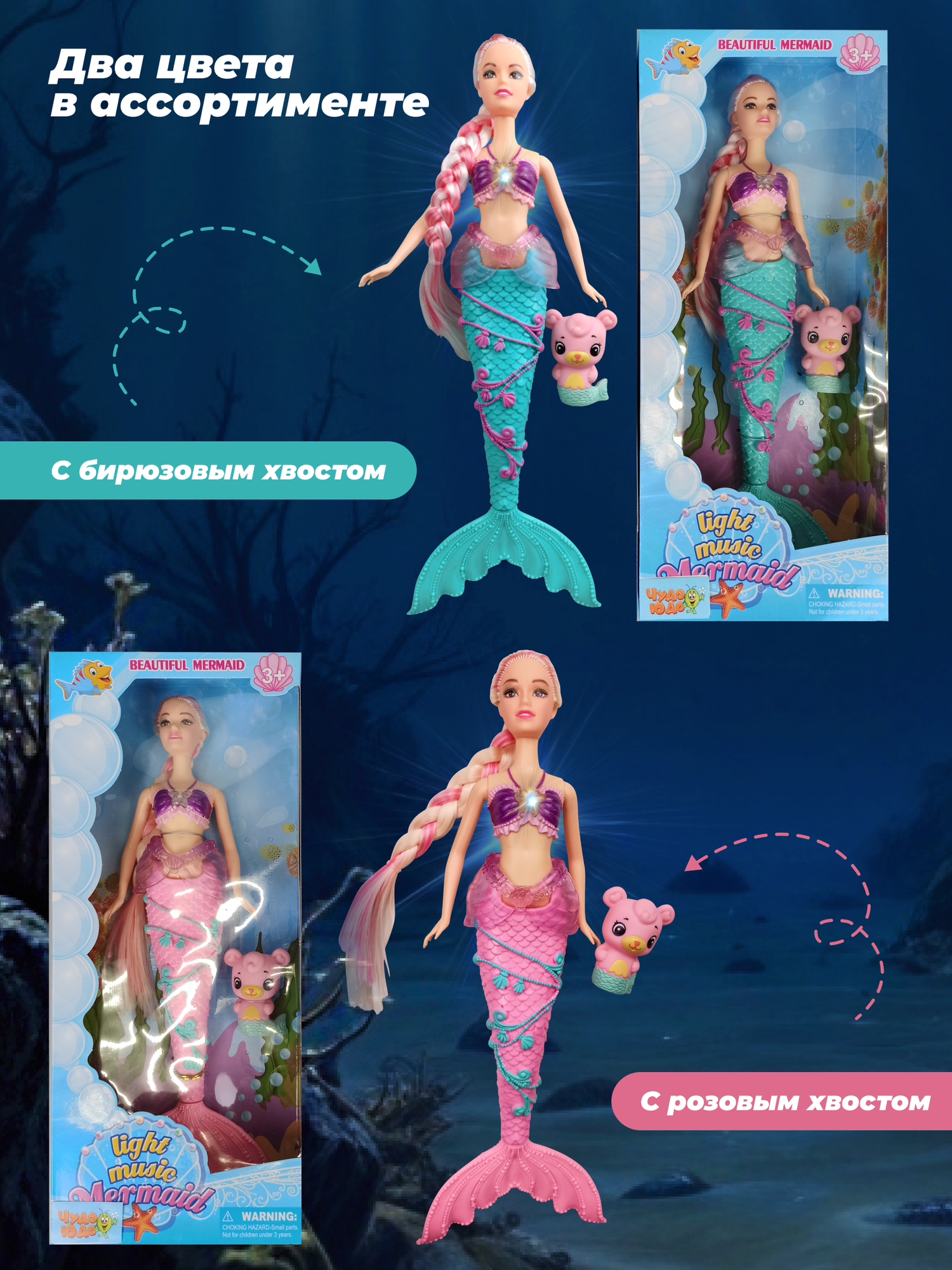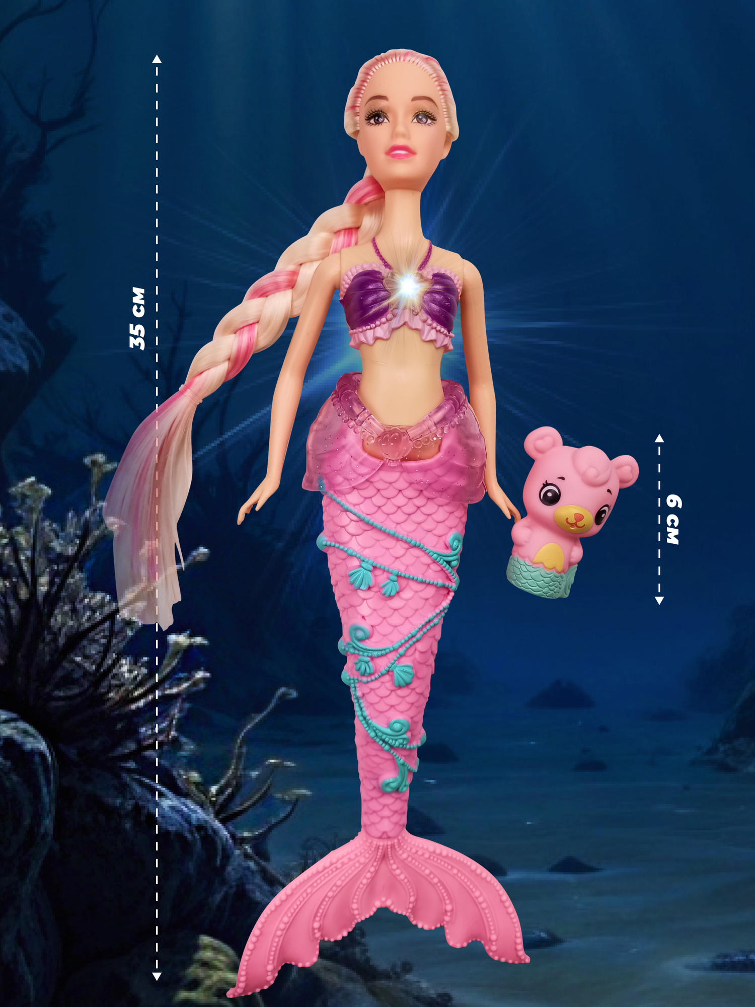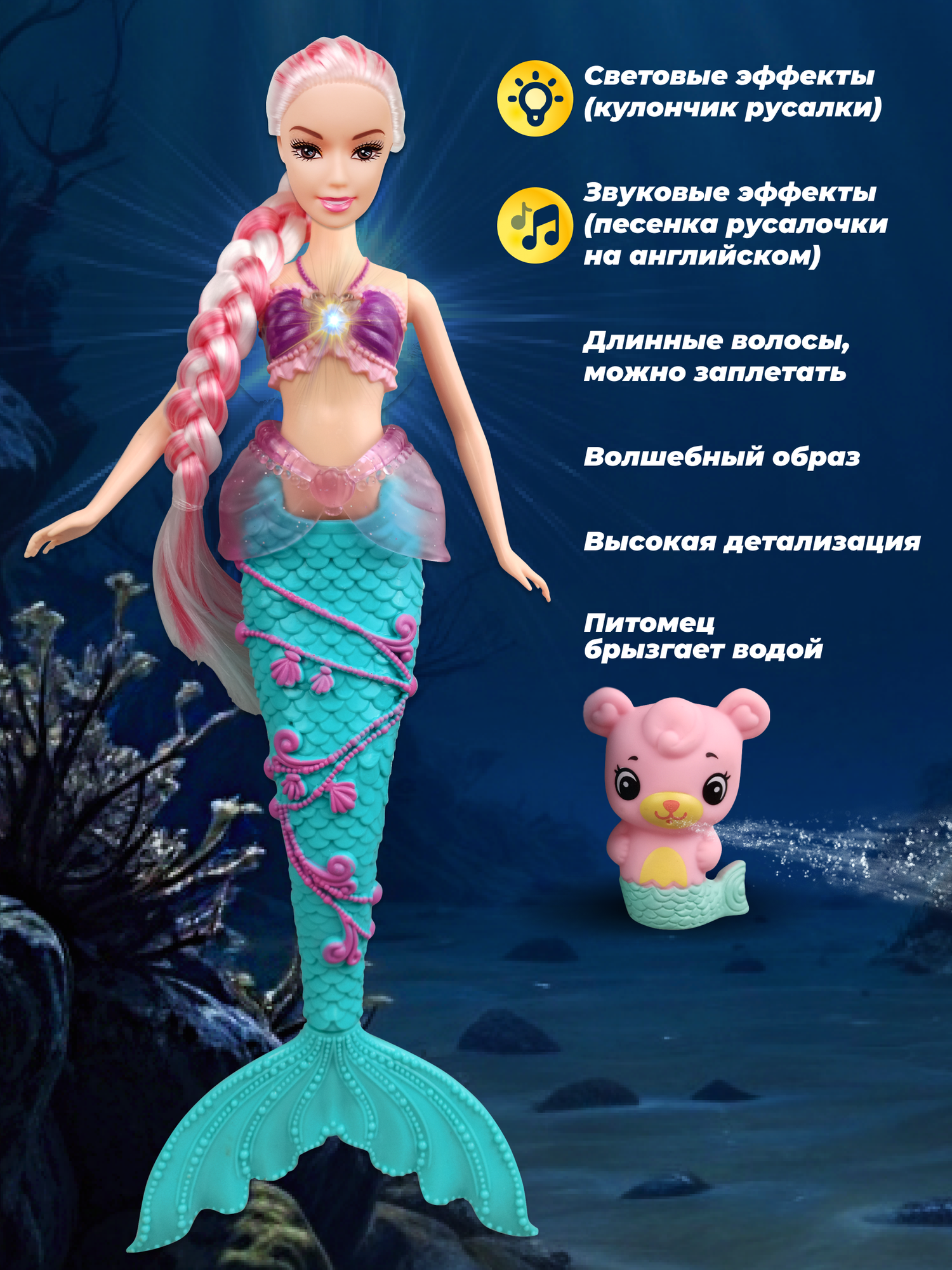 Музыкальная интерактивная игрушка для девочек Кукла Русалка 35 см с питомцем, свет, звук, на батарейках, цвет в ассортименте информация: