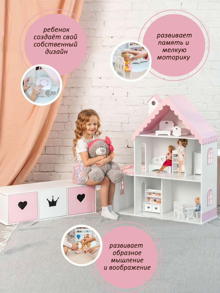 Кукольный домик деревянный с комодом Стефания для кукол до 32 см бело-розовый информация: