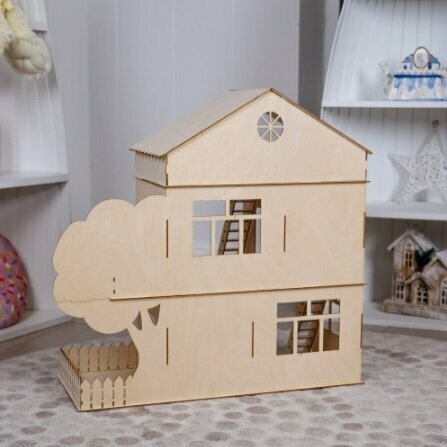 10 цен на Деревянный Кукольный домик "С деревом" (3 этажа, балкон, лужайка. заборчик) для кукол 15-20 см ВхШхГ: 63 х 62 х 25 см