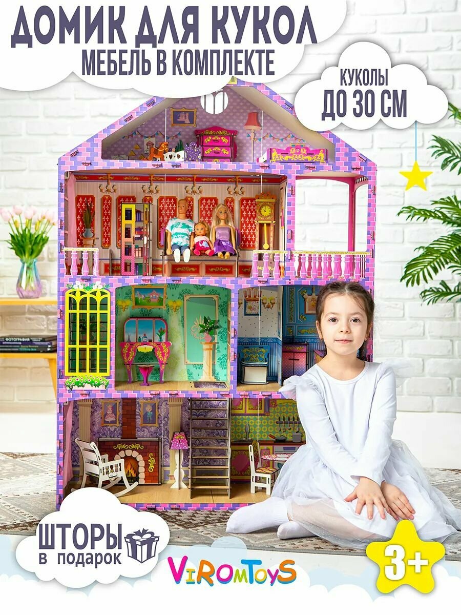 10 цен на Деревянный кукольный домик Барби большой с чердаком и мебелью