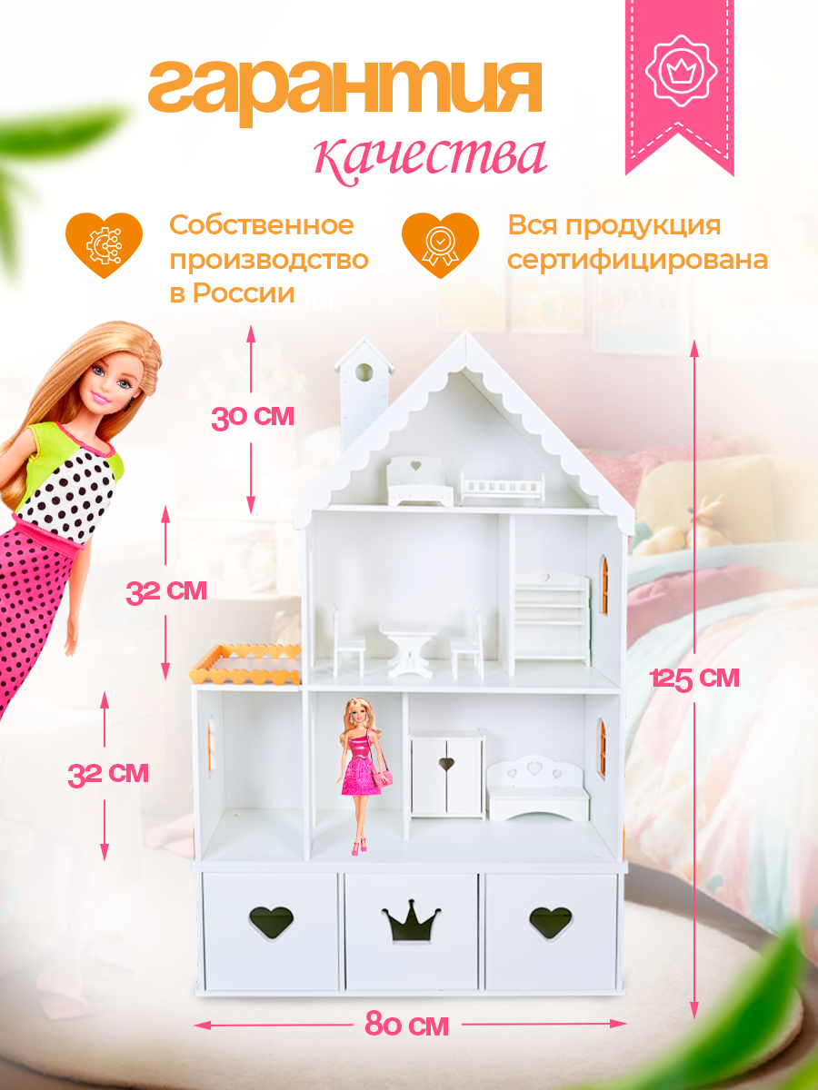 Кукольный домик деревянный с комодом Стефания для кукол до 32 см бело-золотой информация: