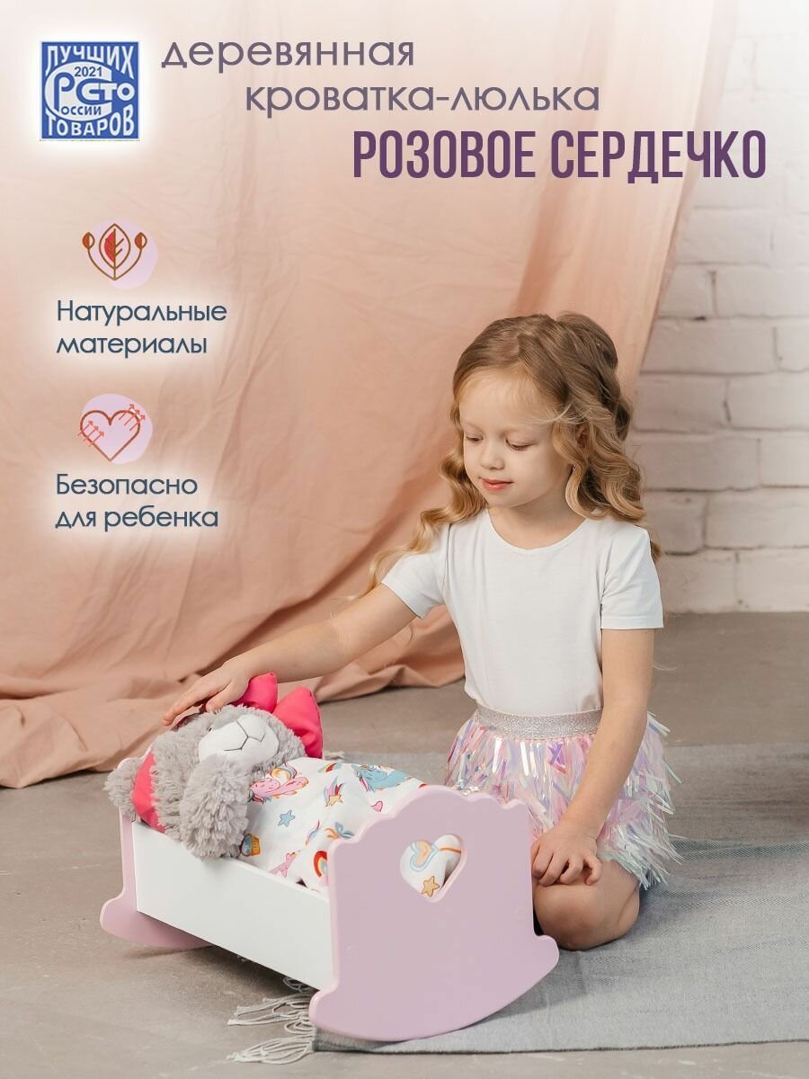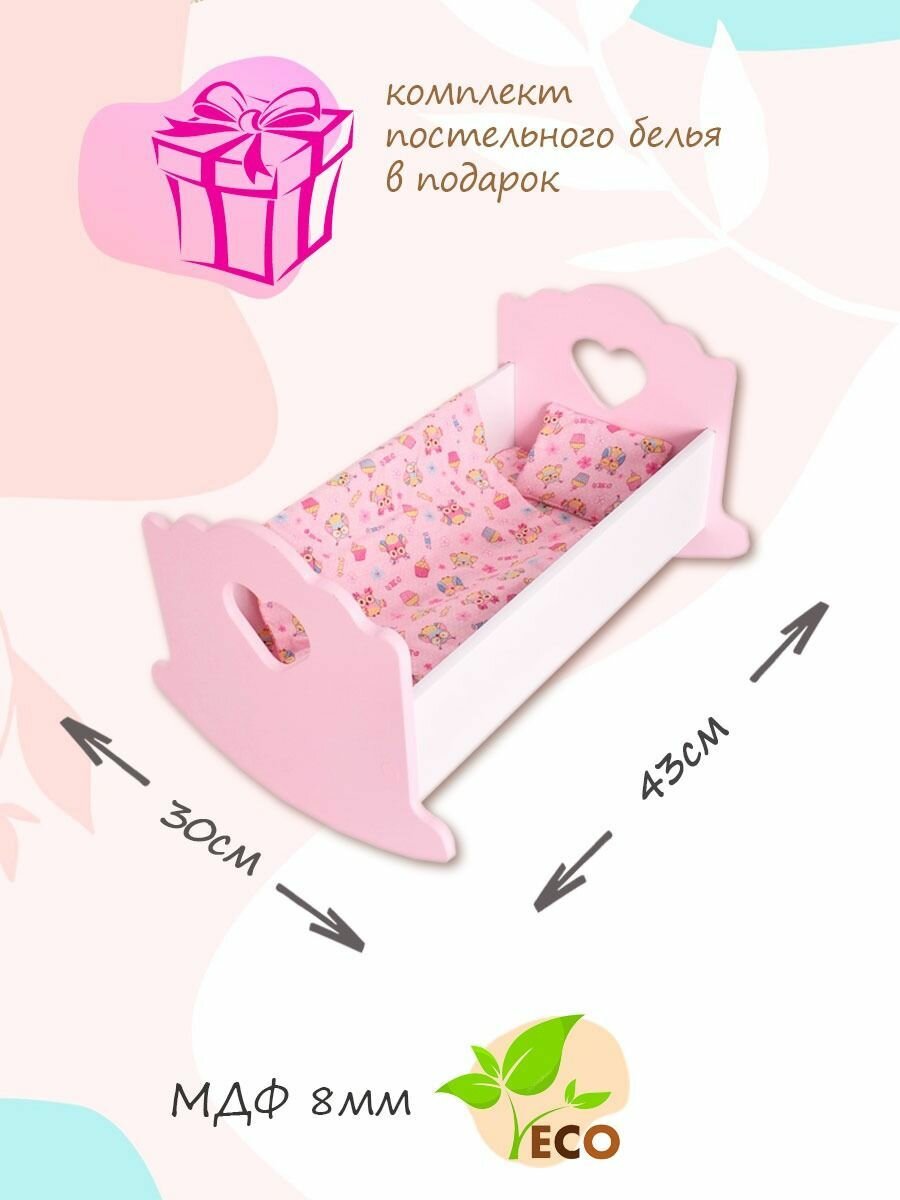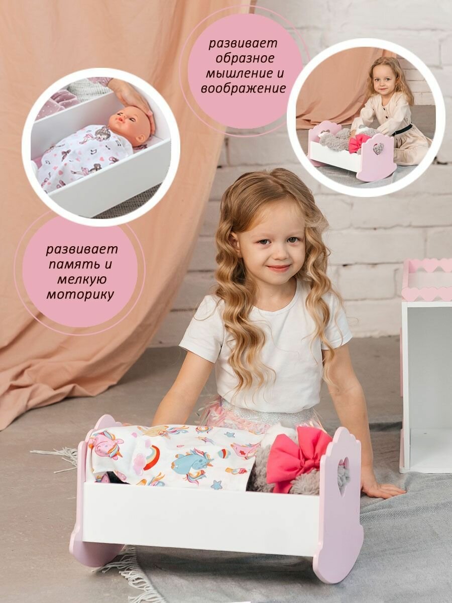 10 цен на Кроватка - качалка для куклы 41 см игрушечная люлька детская деревянная бело-розовая / Постельное белье в подарок