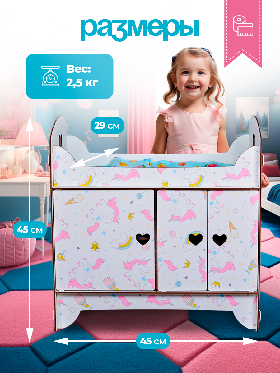 Кроватка со шкафом игрушечная детская для кукол деревянная Единорог / Постельное белье в подарок информация: