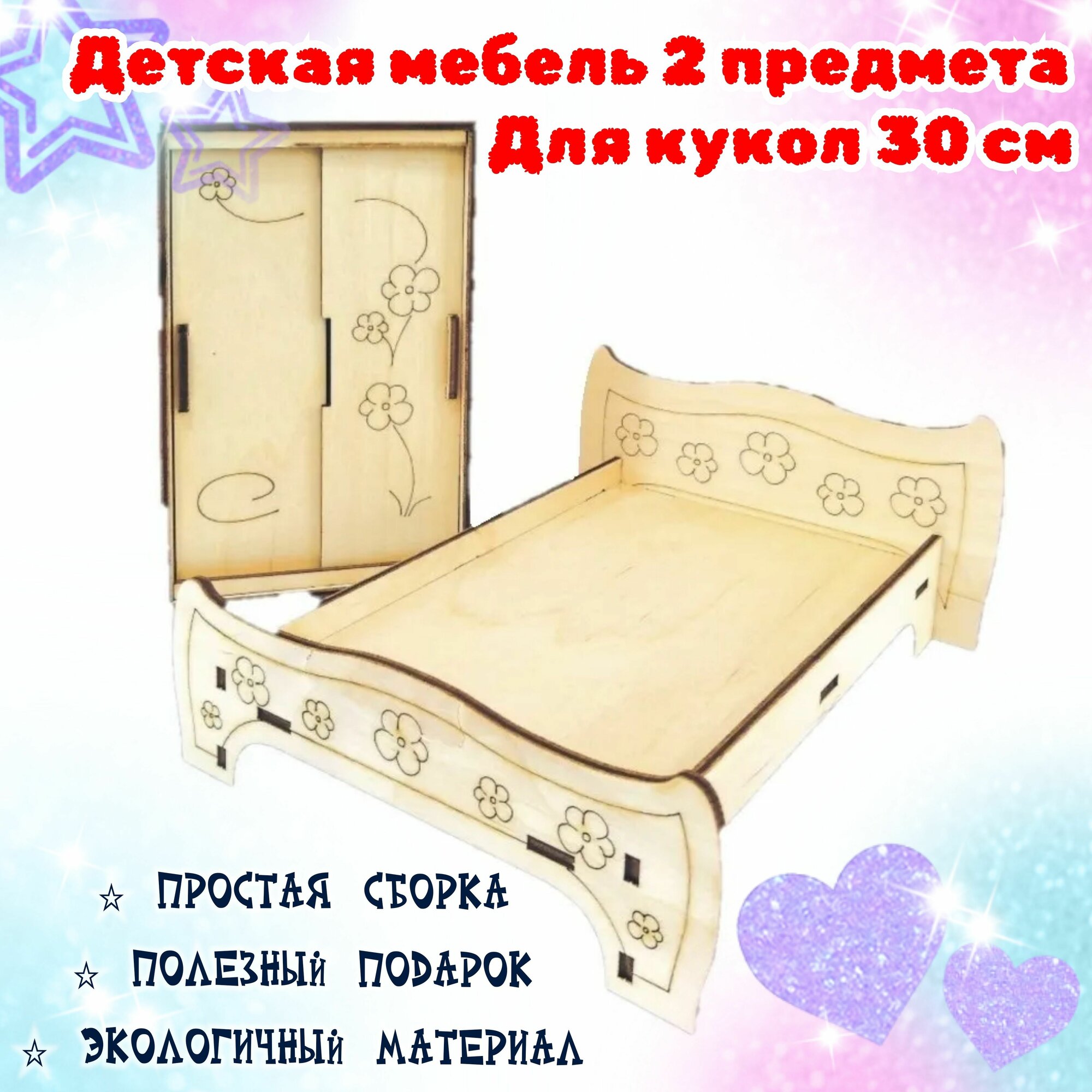 Деревянная детская мебель для кукольного домика "Кровать со шкафом" для кукол 30 см информация: