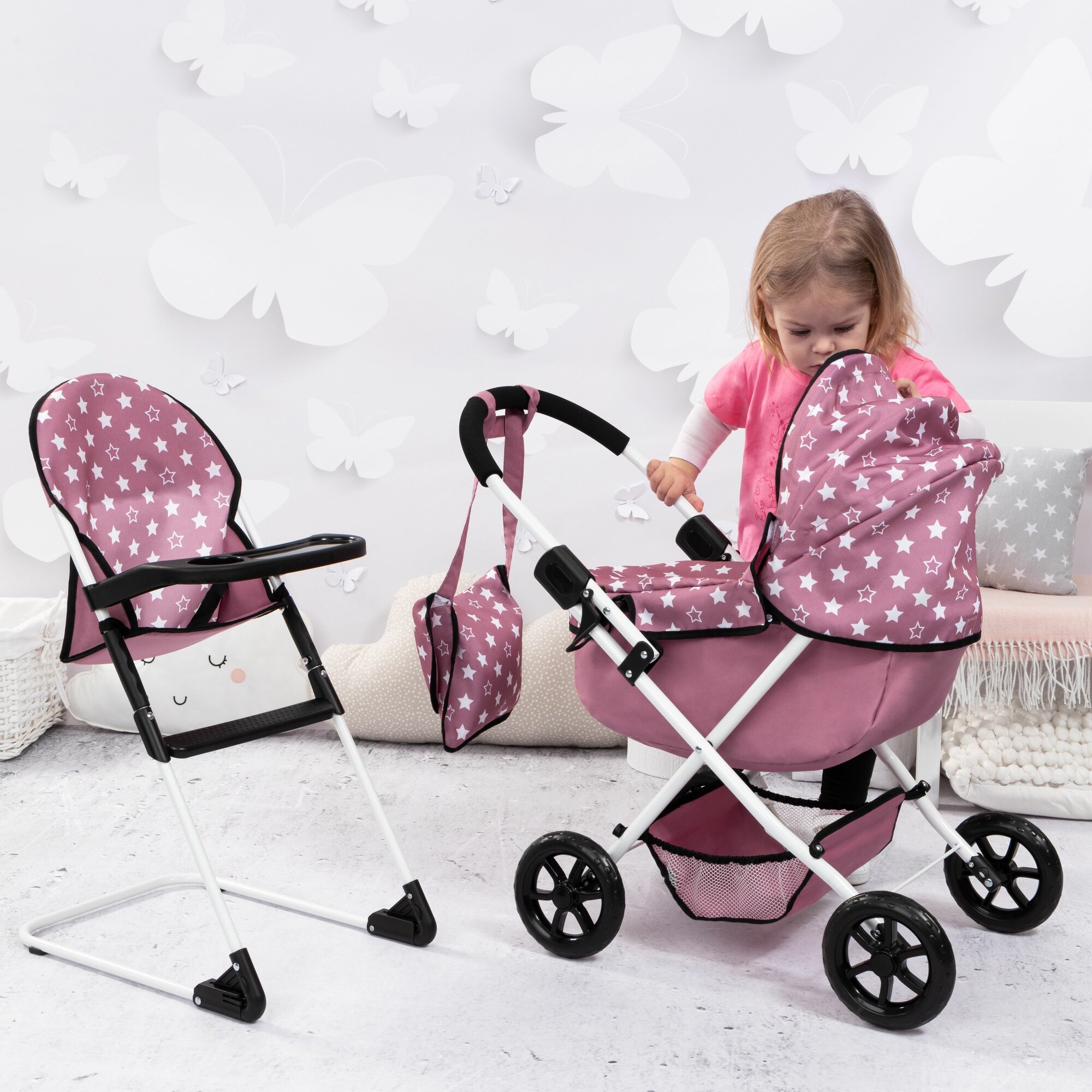Набор для кукол с коляской и стульчиком для кормления розовый