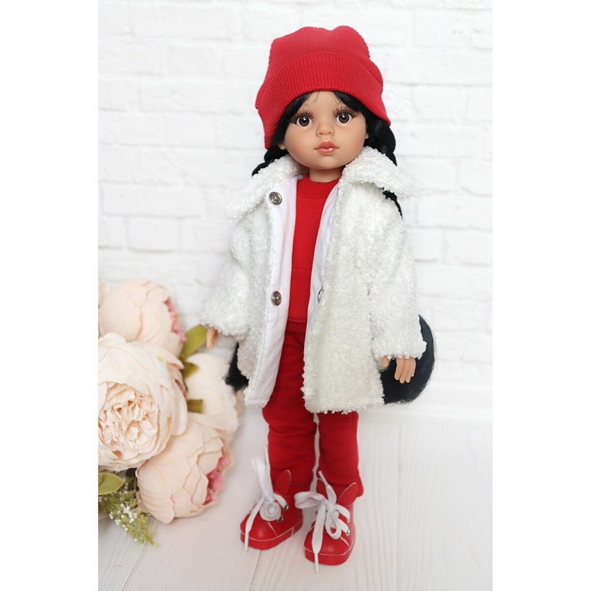 Комплект одежды и обуви для кукол Paola Reina 32 см (шубка ягненок, костюм, шапка, кеды), белый, красный информация: