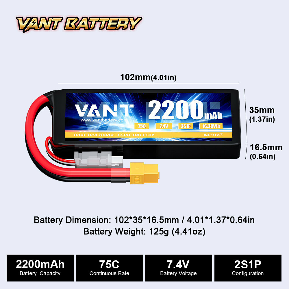 Аккумулятор LiPo Vant - 7.4В 2200мАч 75C (мягкий корпус, 2S, разъём XT60) информация: