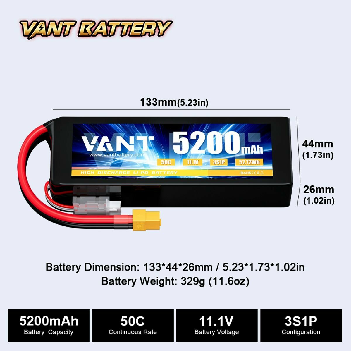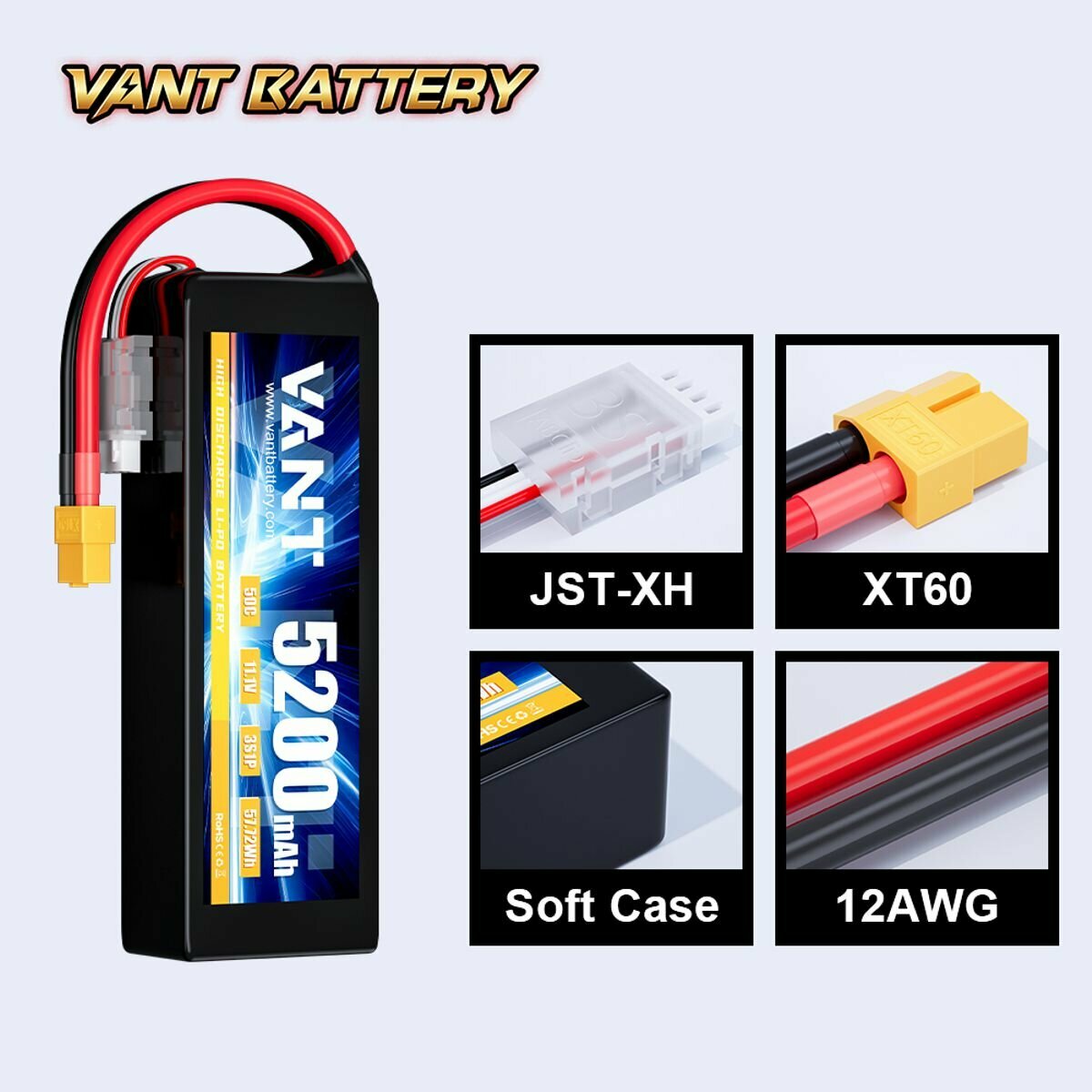 Аккумулятор LiPo Vant - 11.1В 5200мАч 50C (3S, мягкий корпус, разъём XT60) информация: