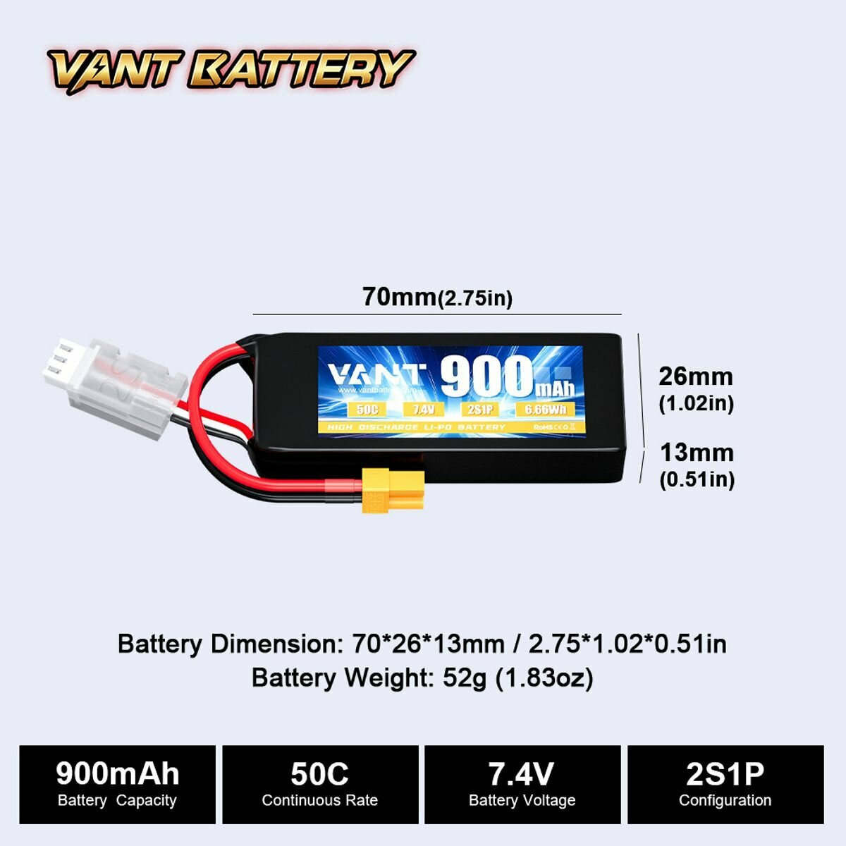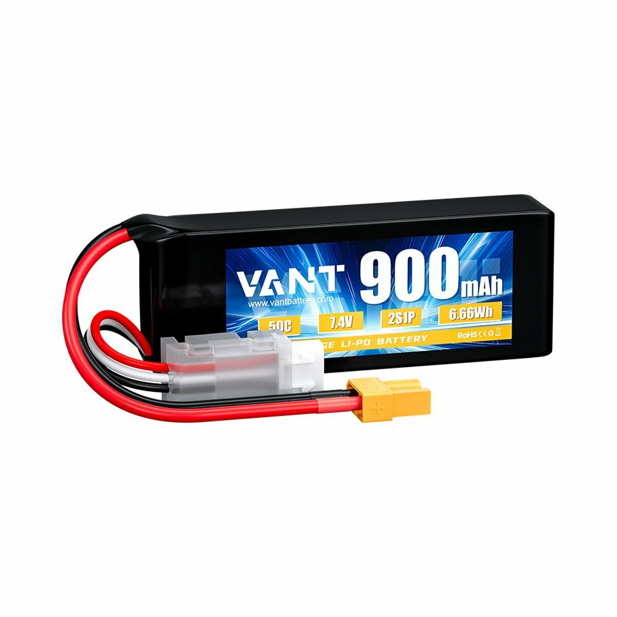 Аккумулятор LiPo Vant - 7.4В 900мАч 50C (мягкий корпус, 2S, разъём XT30) информация: