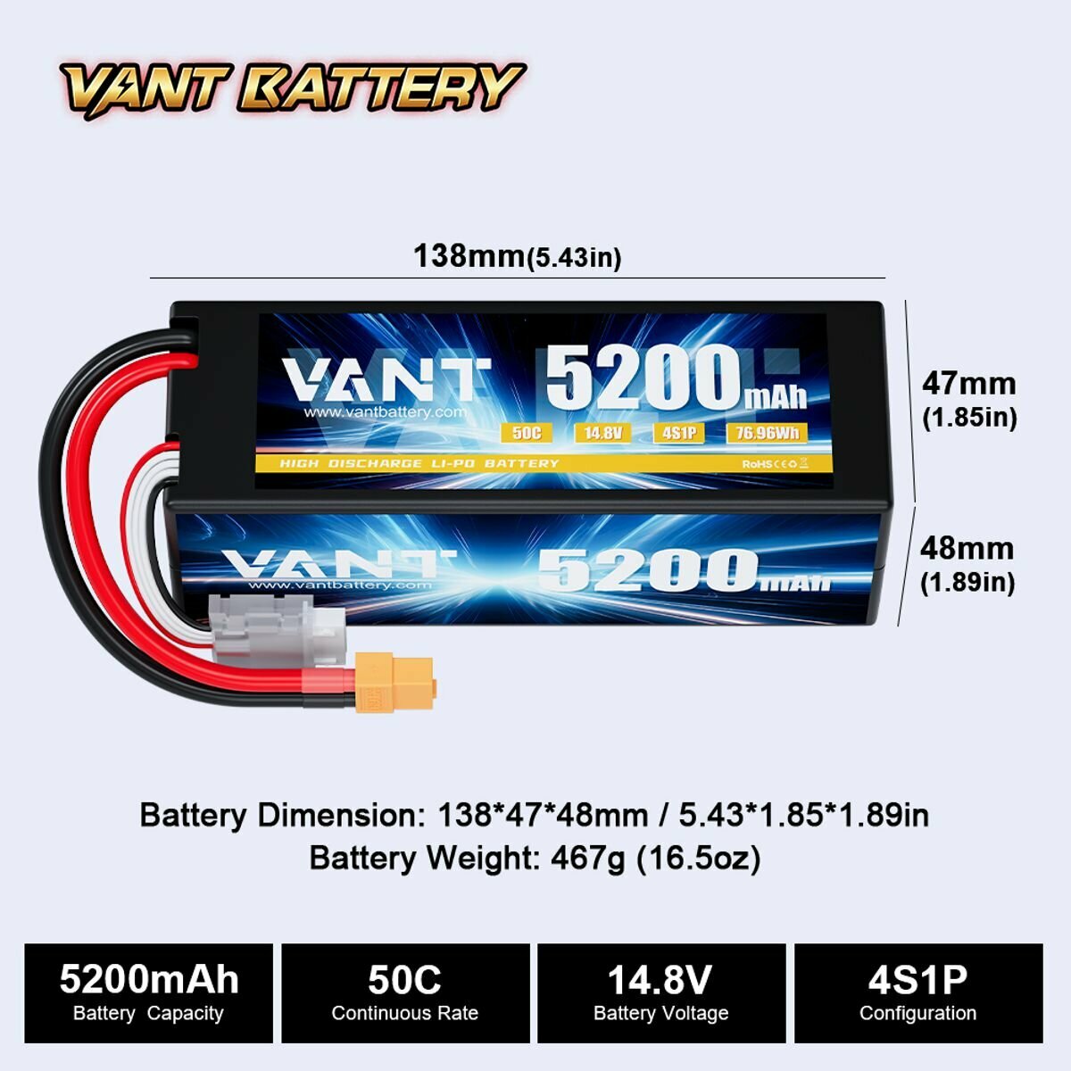 Аккумулятор LiPo Vant - 14.8В 5200мАч 50C (4S, Hardcase, разъём XT60) информация: