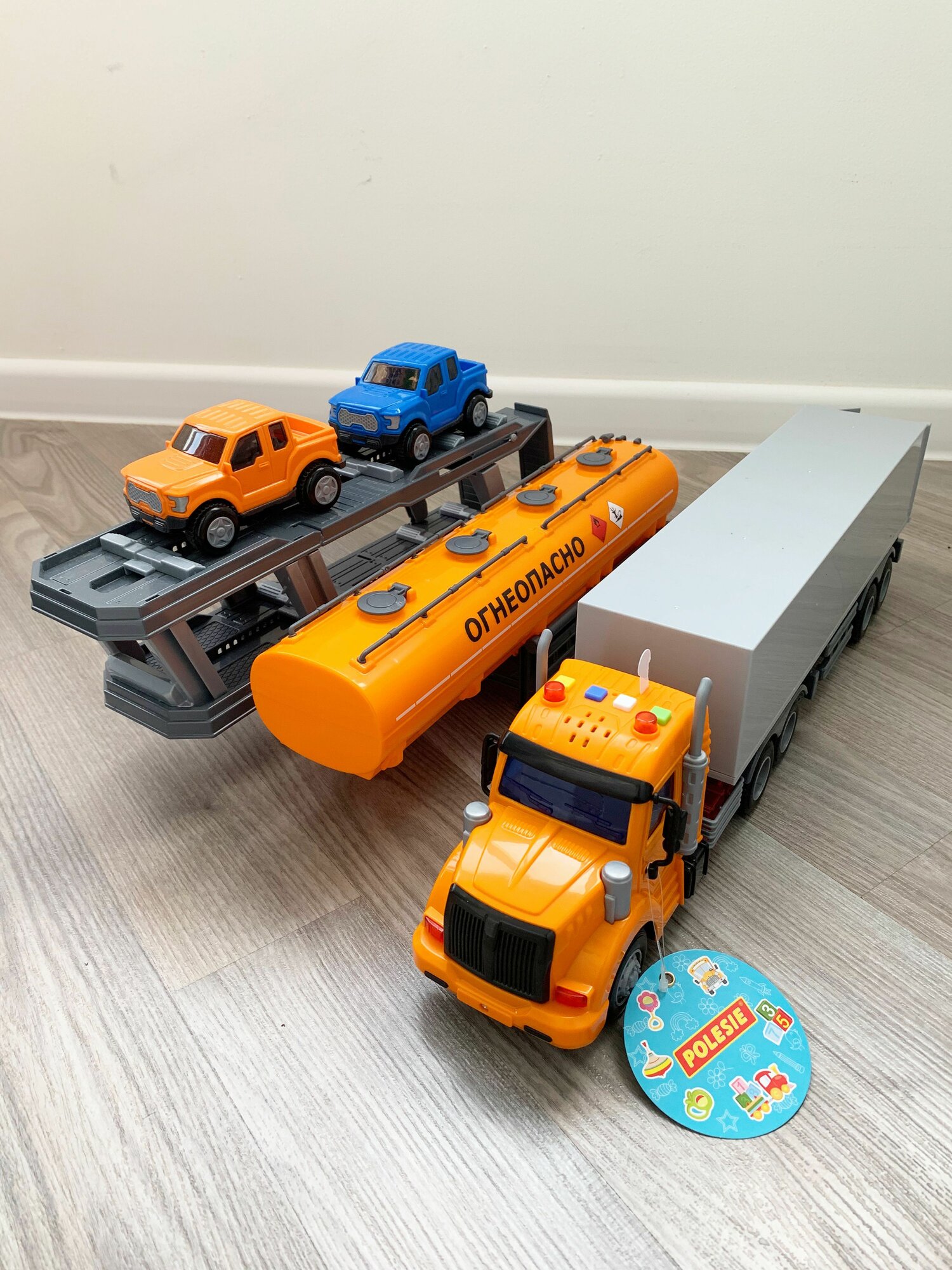 Отзывы на Набор 3 прицепа (фура, бензовоз, автовоз с 2-мя машинками) и тягач (динамо-инерция, свет, 4 звука) Профи Полесье оранжевый