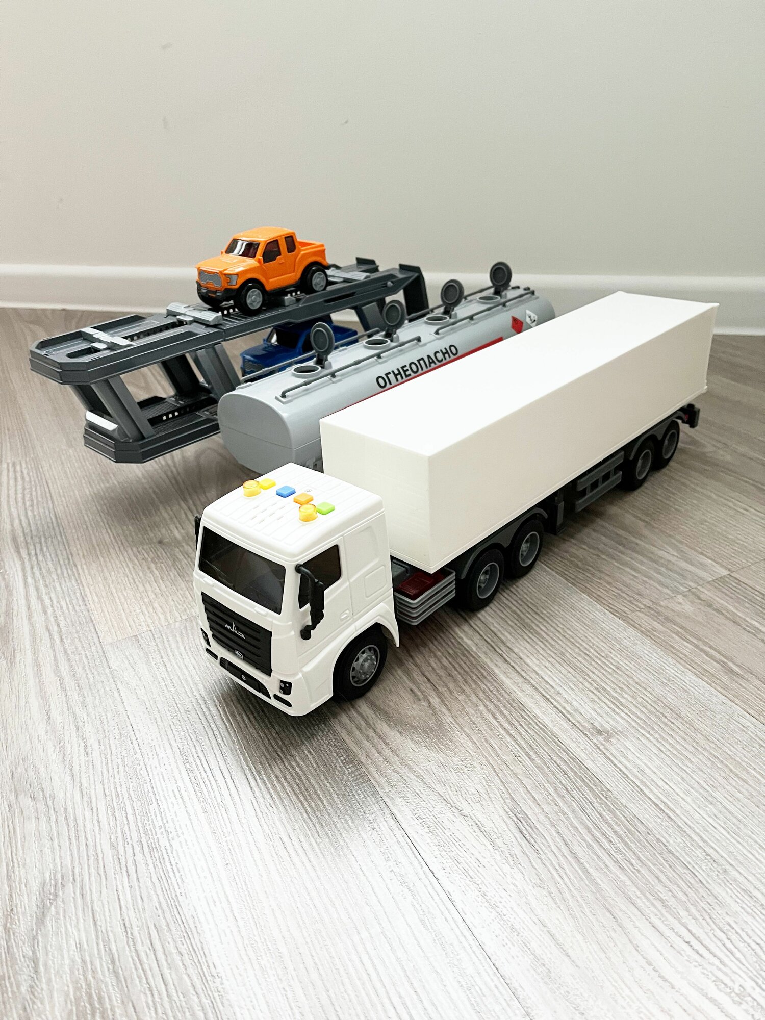 Отзывы на Набор 3 прицепа (фура, бензовоз, автовоз с 2-мя машинками) и тягач МАЗ (динамо-инерция, свет, 4 звука) / Полесье - серый