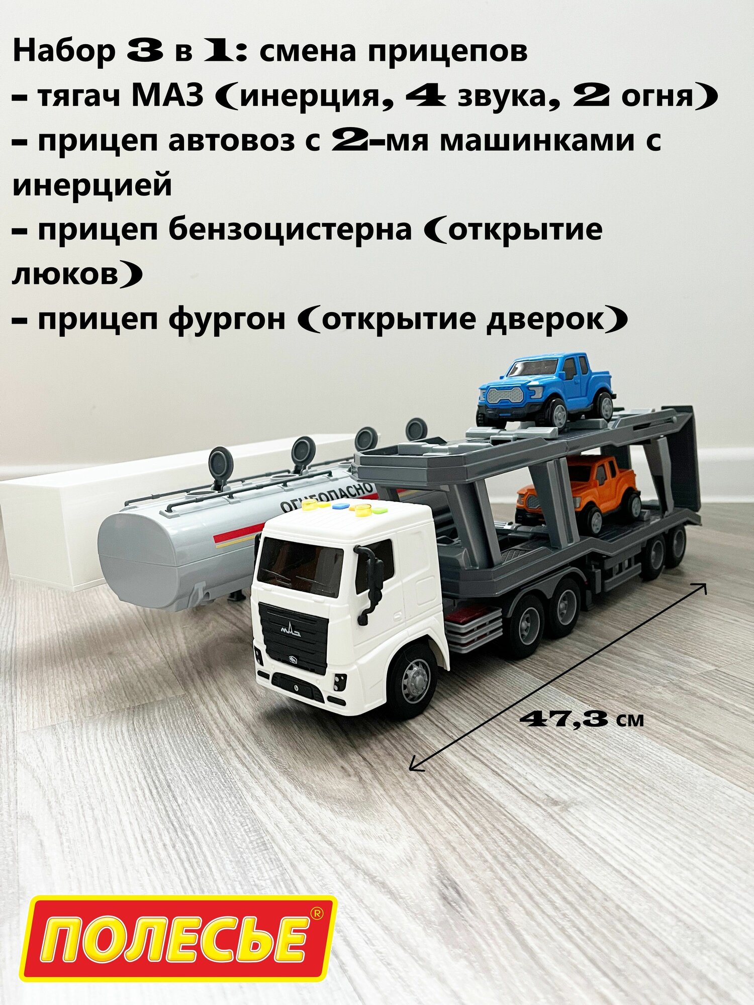 Набор 3 прицепа (фура, бензовоз, автовоз с 2-мя машинками) и тягач МАЗ (динамо-инерция, свет, 4 звука) / Полесье - серый информация: