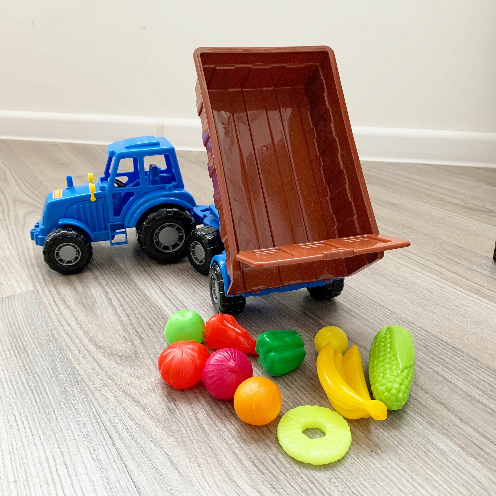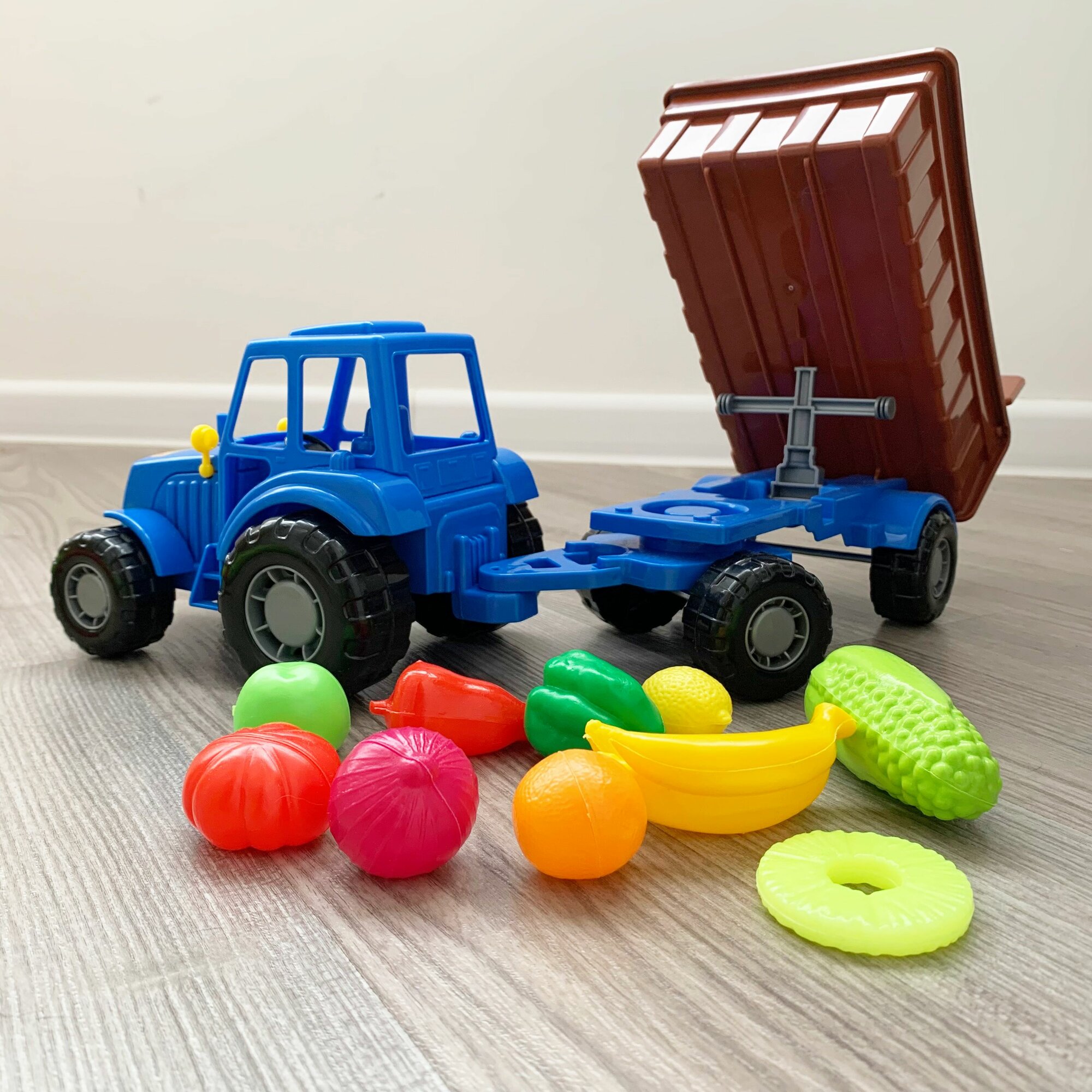 Развивающий игровой набор: 10 шт. мини овощей и фруктов + синий трактор 44,7 см с кузовным прицепом / Полесье