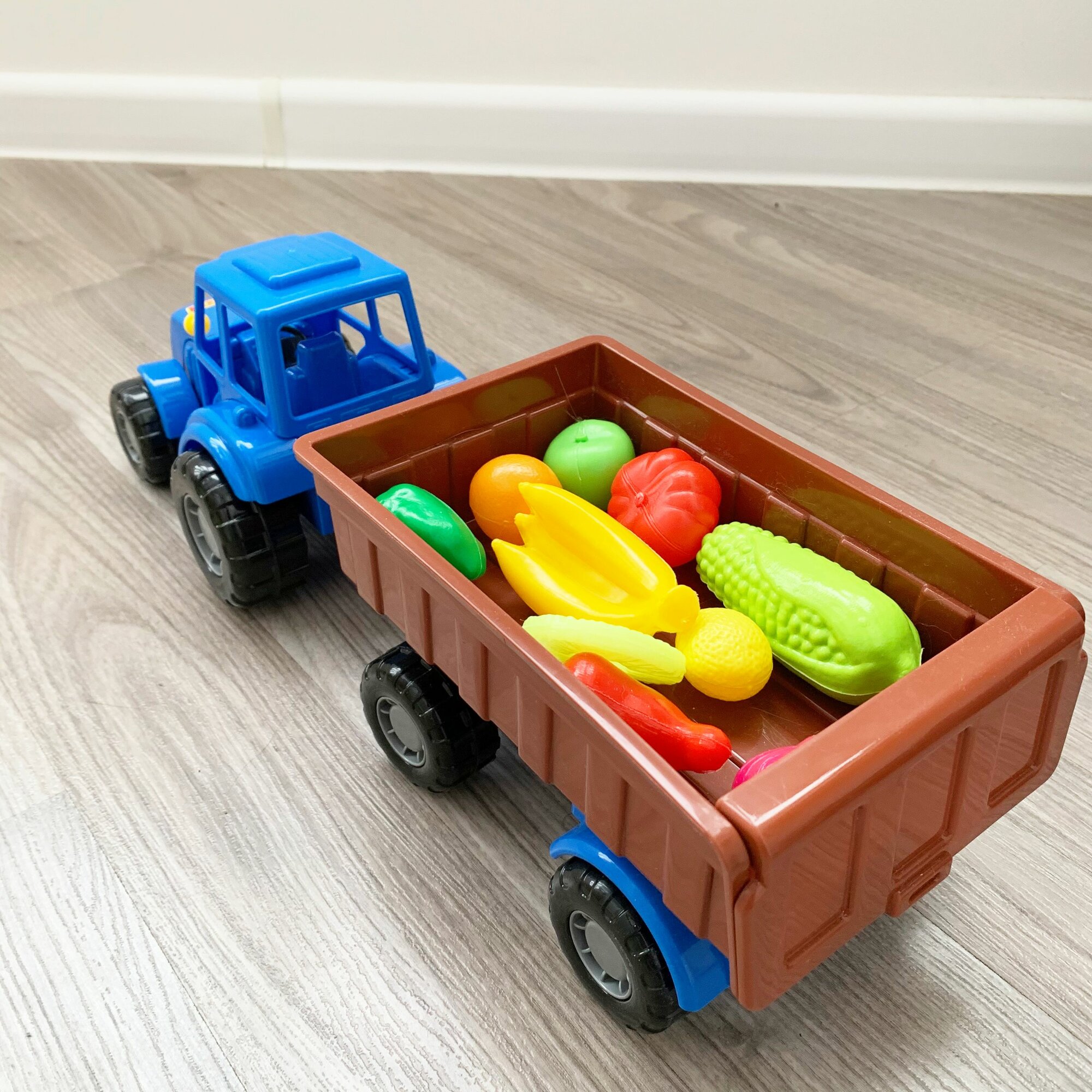10 цен на Развивающий игровой набор: 10 шт. мини овощей и фруктов + синий трактор 44,7 см с кузовным прицепом / Полесье