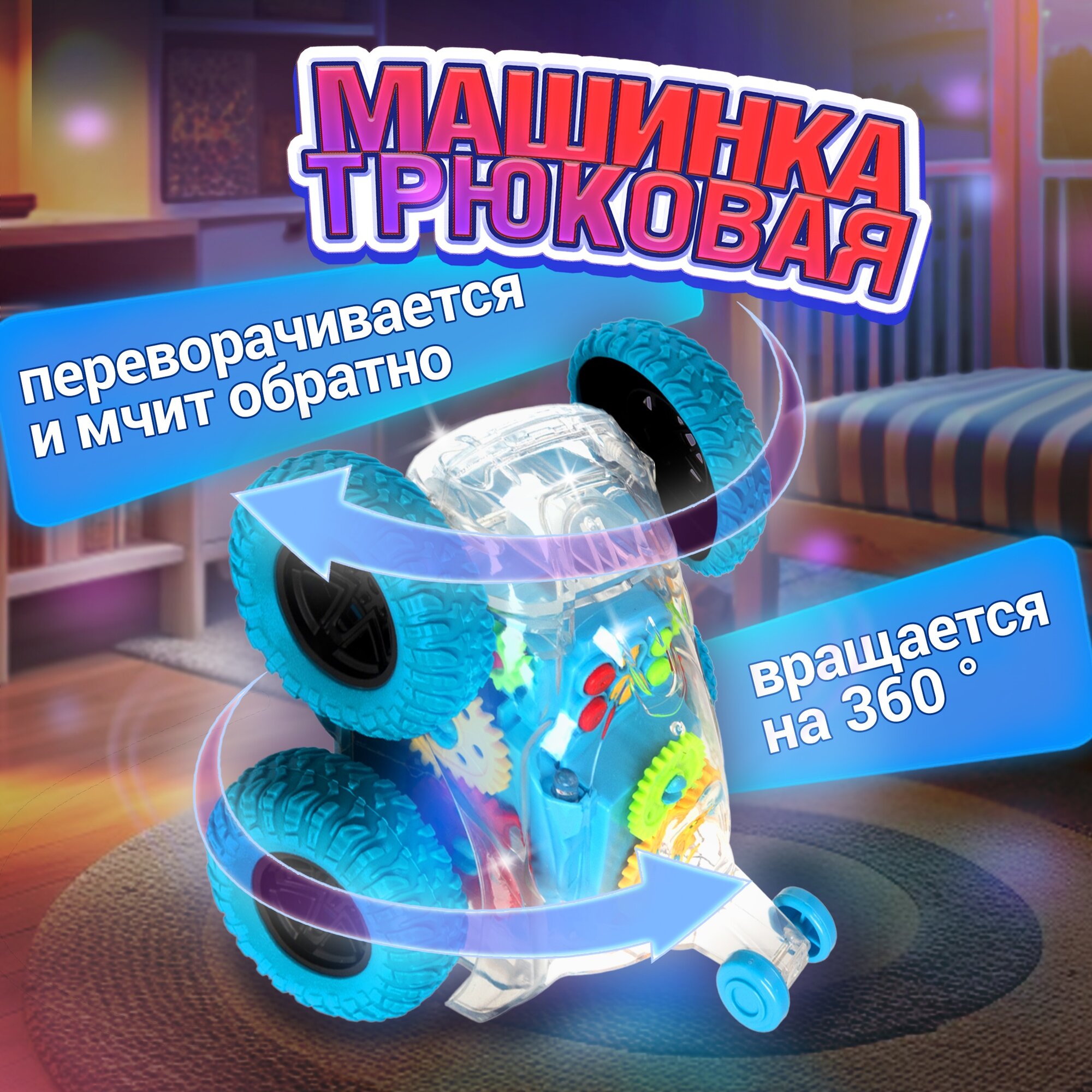 10 цен на Машинка 1TOY Движок, трюковая, прозрачная с шестеренками, со светом и звуком, 1 шт.