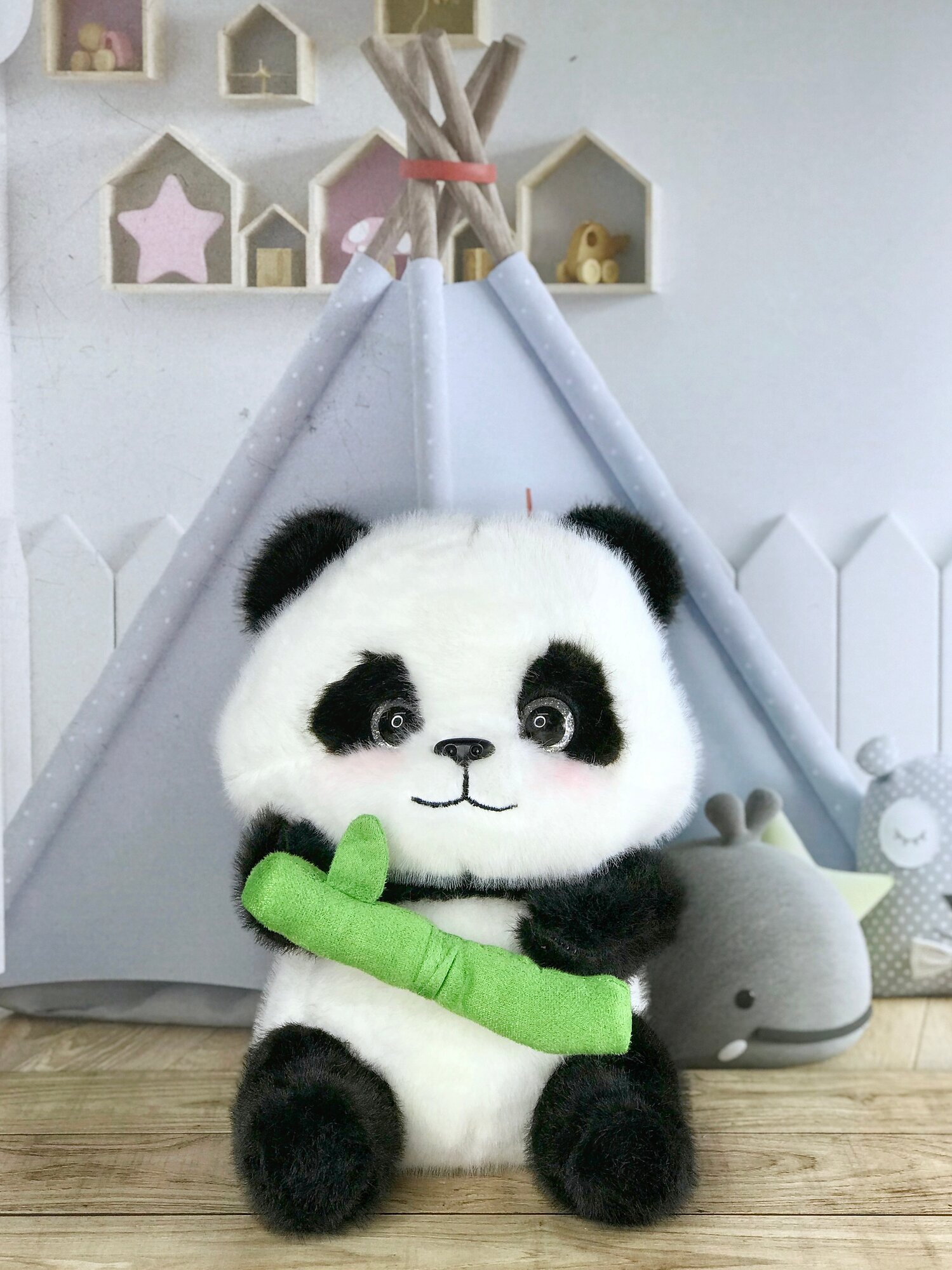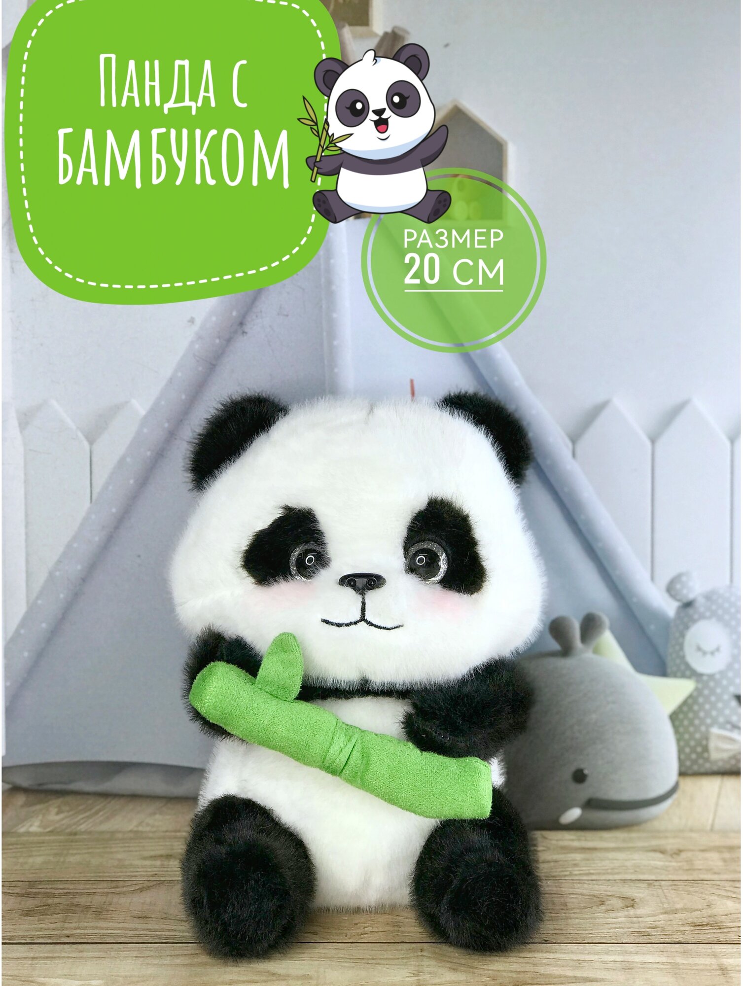 10 цен на Мягкая игрушка Панда с бамбуком 20 см. черно-белая/салатовая