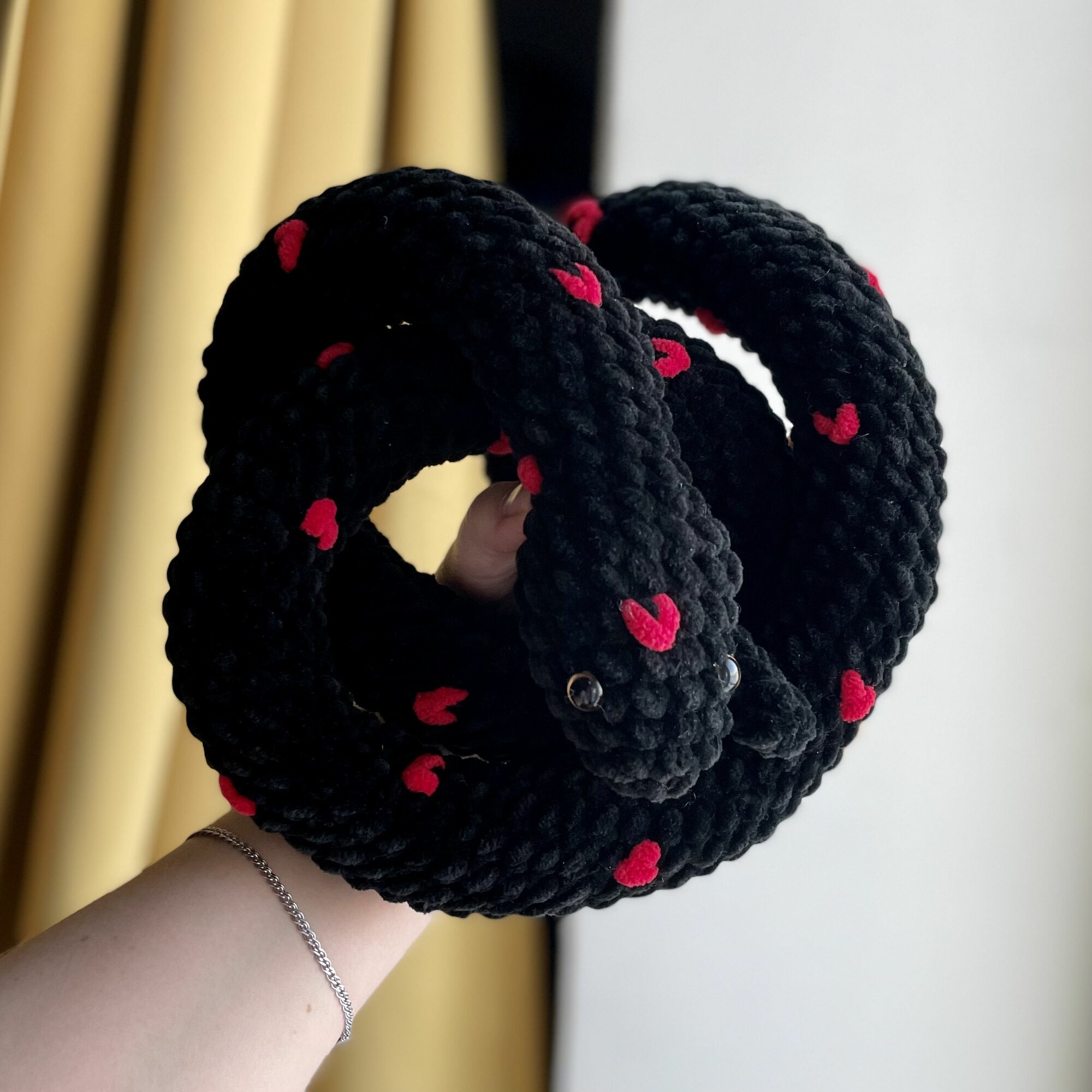 Вязаная мягкая игрушка "Змея" / змейка с сердечками / черный 100 см информация: