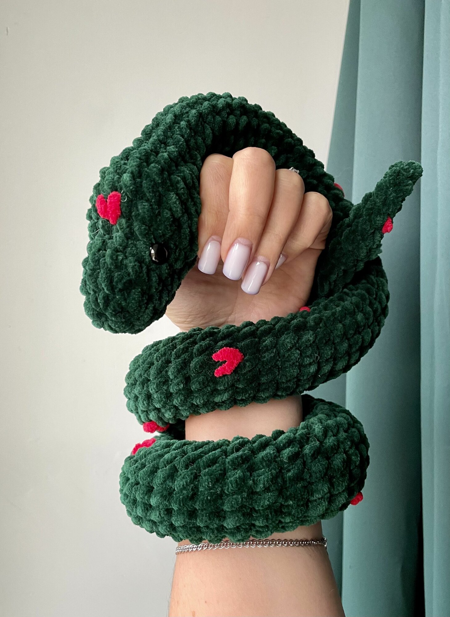 Отзывы на Вязаная мягкая игрушка "Змея" / змейка с сердечками / зеленый 100 см