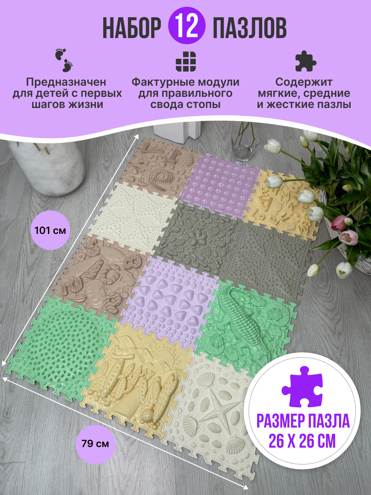 Отзывы на Коврик массажный игровой модульный напольный "Dr.Ortman", фактурный коврик-пазл, спортивный, 12 штук