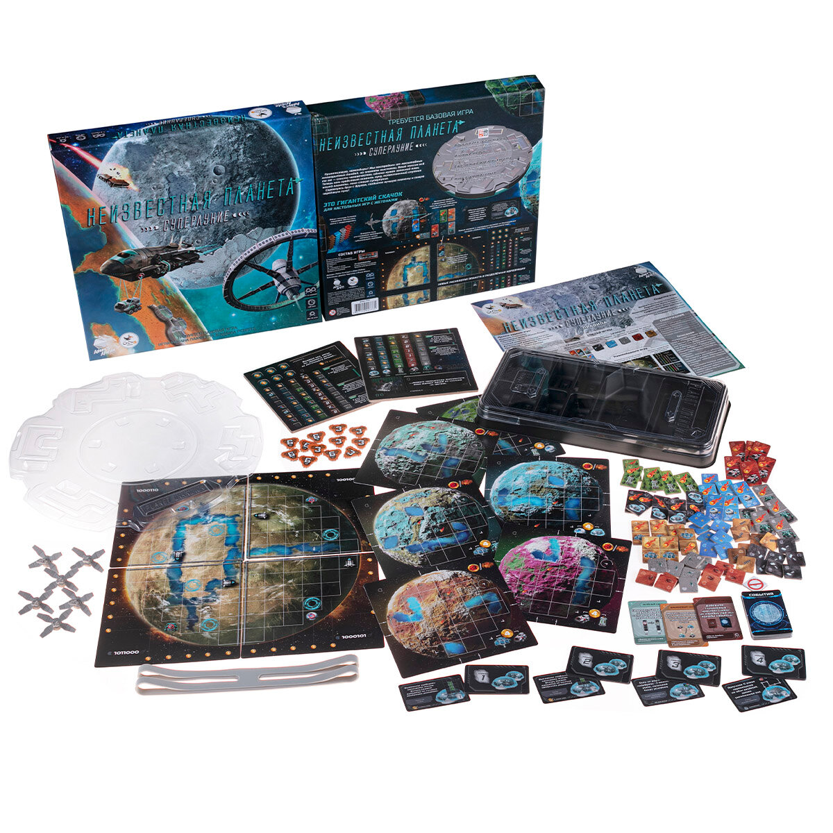 | Комплектация | 1-й модуль 6 планшетов лун (Лицевая сторона - начальная. Обратная сторона - уникальная), 6 орбитальных спутников, 2-й модуль 36 аварийных жетонов (по 6 каждого типа), 3-й модуль 6+ массивов поселенцев, 6+ массивов воды, 6+ массивов исследований, 6+ массивов вездеходов, 6+ массивов электроснабжения А также 20 карт освоения (5 карт 1-го уровня, 5 карт 2-го уровня, 5 карт 3-го уровня, 5 карт 4-го уровня), 27 карт событий (9 с зелёным сигналом, 9 с оранжевым сигналом, 9 с красным сигналом), 12 множителей метеоритов (по 6 каждого вида), Планшет расколотой планеты (состоит из 4 четвертей), Планшет разделённой корпорации (состоит из 2 половин), Крышка для органайзера S. U. S. A. N. |