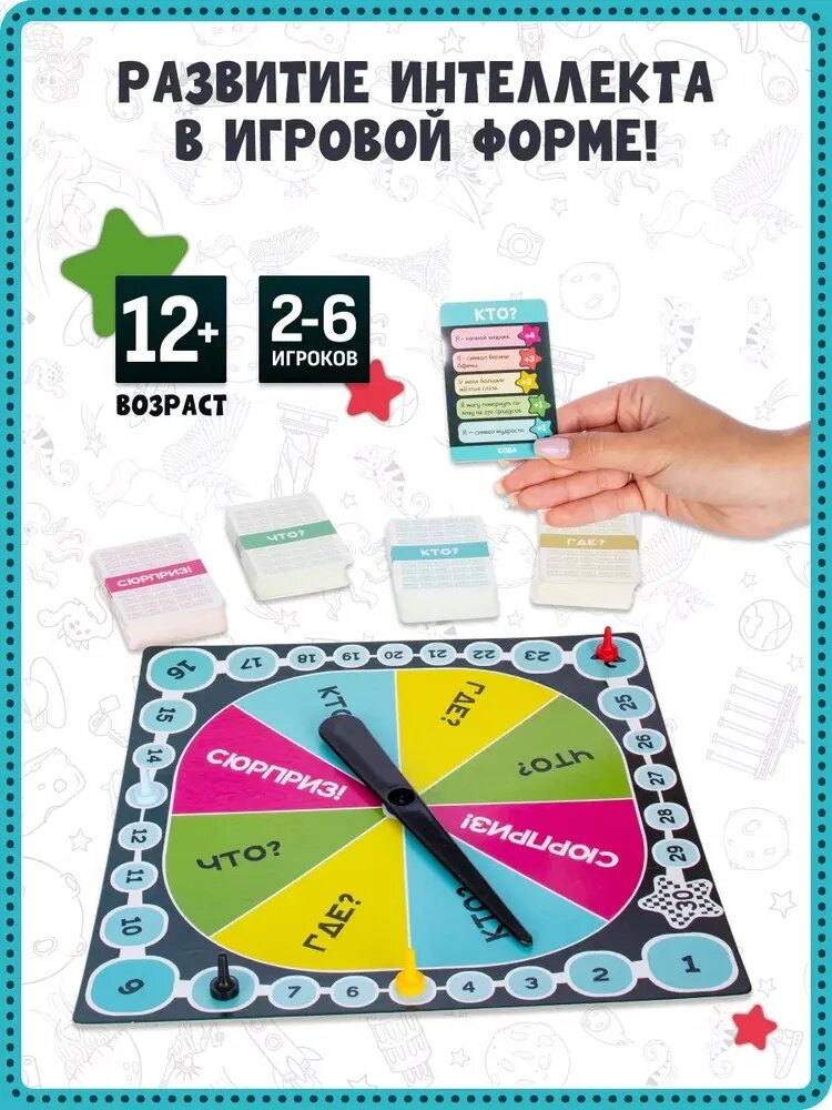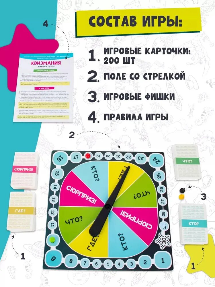 | Комплектация | игровые карточки- 200 шт.; поле со стрелкой; игровые фишки; правила игры |