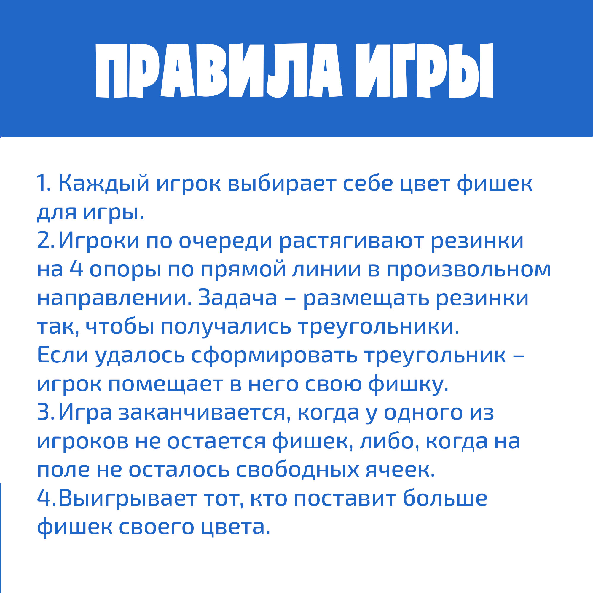 | Подробная комплектация | 84 фишки (по 21 фишке каждого цвета), 4 подставки под фишки, игровое поле, резинки |