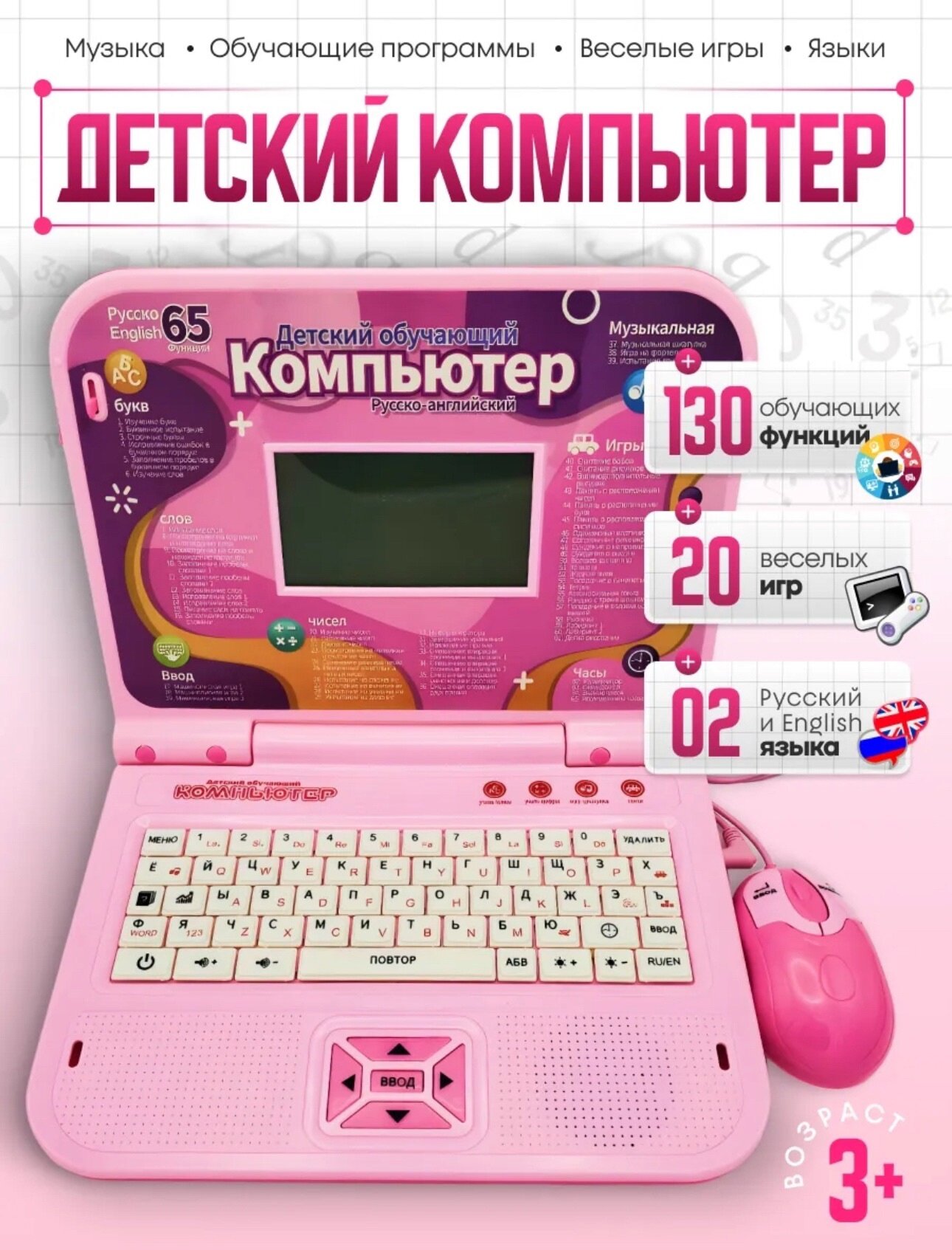 Ноутбук с мышкой для детей, обучающий, 35 развивающих программ, розовый информация: