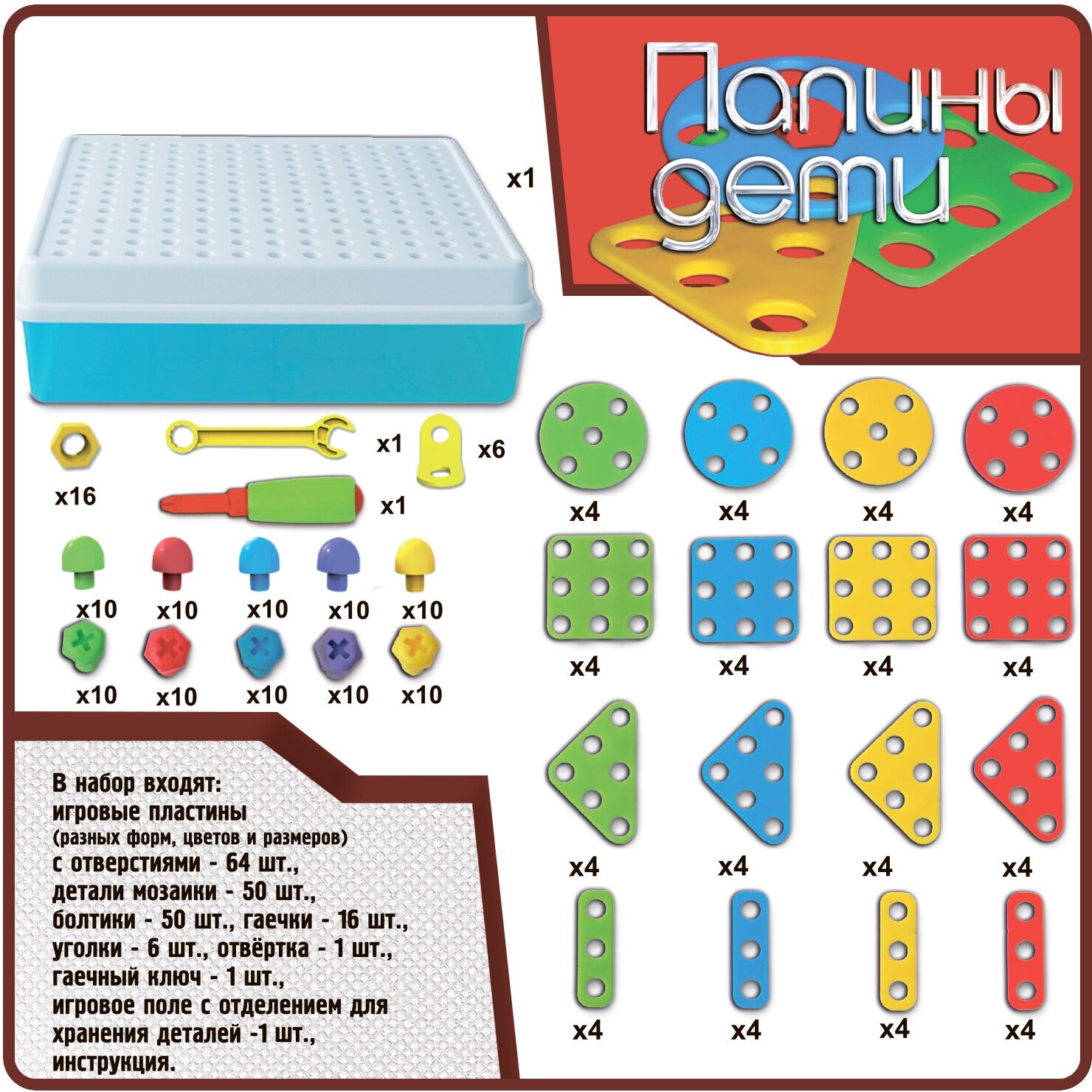 | Дополнительная информация | 64 игровые пластины с отверстиями, 50 деталей мозаики, 50 болтиков, 16 гаечек, 6 уголков, отвертка, гаечный ключ, игровое поле с отделениями для хранения деталей, инструкция; количество цветов 5 |