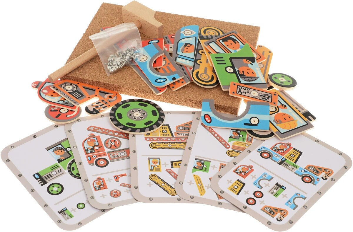 | Дополнительная информация | Пробковая доска для сборки моделей Деревянный молоток 5 двусторонних карточек с инструкцией по сборке 40 гвоздиков Деревянные детали машин |