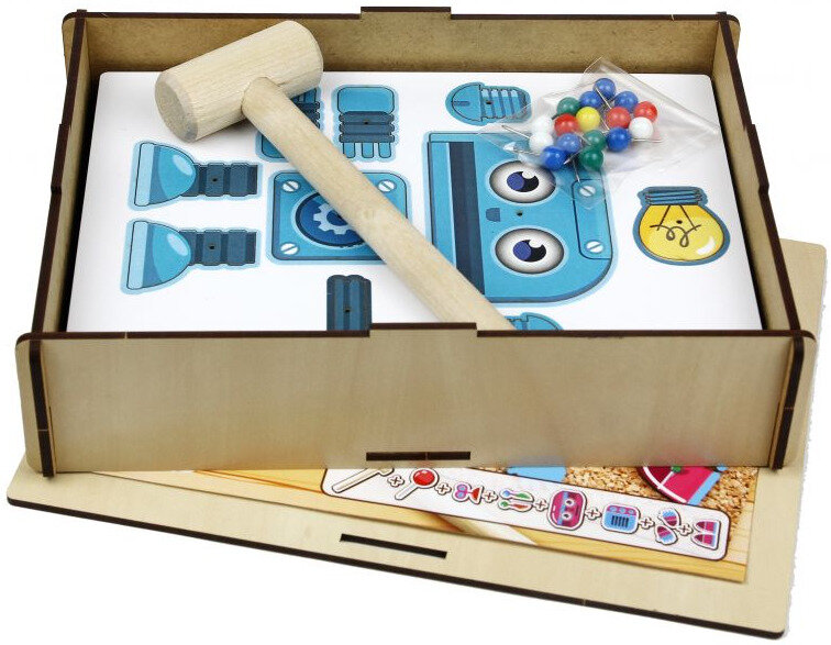 Развивающий деревянный конструктор-мозаика Веселые гвоздики "Роботы", с молоточком информация: