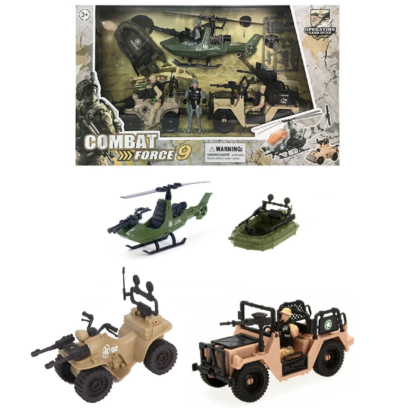 | Комплектация | - 4 подвижные фигурки военных высотой 10 см, - лодка 13 х 7 х 3 см, - вертолет 23 х 5 х 11 см, - джип 21 х 7 х 10 см, - мотоцикл 12 х 6 х 9,5 см, -9 аксессуаров. |