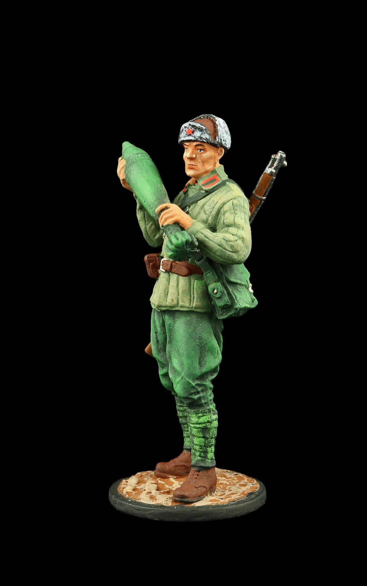 Оловянный солдатик SDS: Красноармеец-миномётчик с миной к 120-мм полковому миномёту, 1941-43гг. СССР информация: