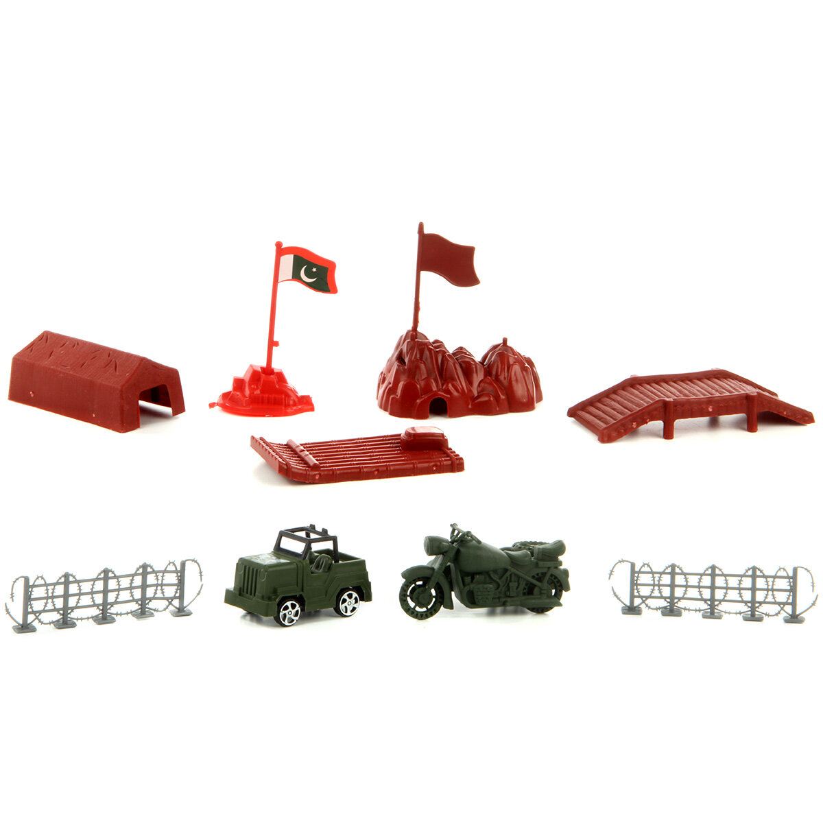 | Подробная комплектация | В комплект входит мотоцикл, машинка, 2 моста, 2 флага, 2 забора, палатка, 29 солдатиков. |
