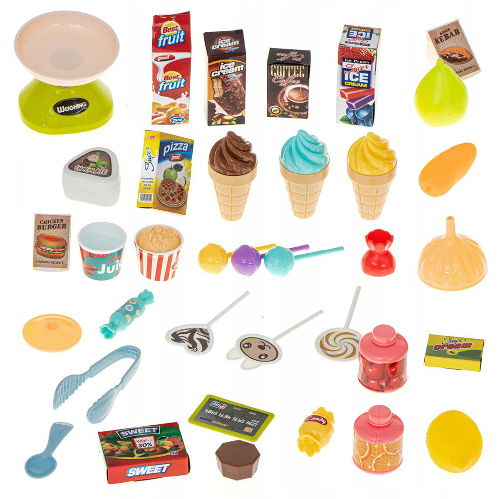 | Комплектация | супермаркет с кассой (размер в собранном виде 37х20х38.5см) / тележка детская для супермаркета (размер 30х17.5х29.5см). Также в комплект входит 40 предметов: весы с подвижной чашей / банковская карта / кран с подвижной ручкой / щипцы / ложка / креманка / лимон / груша / морковь / стаканчик / попкорн / баночка / упаковки / игрушечные продукты / а также сладости: разноцветные леденцы на палочке / рожок мороженое / конфеты. |